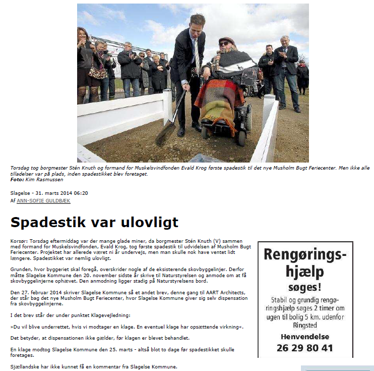 Lokalplan 1100 Musholm Bugt Feriecenter, Korsør blev taget af dagsordenen. Byrådet valgte dog at vedtage planen med tilrettelser - herunder de vi havde bedt om. Hele teksten om Svend Aukens dispensation til Centeret er kommet med, men det er ikke bare nok. Slagelse kommune vil ikke gribe ind overfor den almindelige hoteldrift man allerede har etableret og vil udbygge derude. Så er forudsætningen for den generøse dispensation efter vor mening bristet. Centeret skulle forbeholdes handicappede og ikke være for alle. Derfor indgiver vi klage over lokalplanen til Natur- og Miljøklagenævnet. Vi skrev til den nye miljøminister Ida Auken og hun forklarede os, at man var magtesløse - hvis man lejede ud til andre end handicappede. Det mener vi ikke er rigtigt. Der blev givet en dispensation på bestemte betingelser, hvis de ikke overholdes så er forudsætningerne for lokalplanen ikke opfyldt. Hvor svært kan det være?