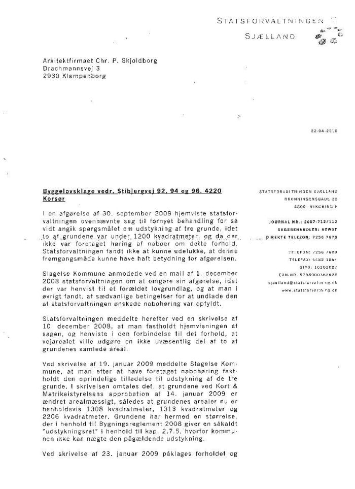 Vedr.: KLAGE OVER AFGØRELSER TRUFFET AF SLAGELSE KOMMUNE OG STATSFORVALTNINGEN SJÆLLAND I FORBINDELSE MED UDSTYKNING OG OPFØRELSE AF 3 SOMMERHUSE, STIBJERGVEJ 92, 94 og 96, 4220 SLAGELSE KOMMUNE