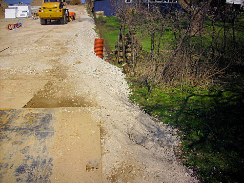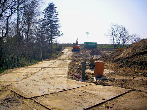Der er lagt køreplader på og man er ved at lave vej. Man rydder skellet for beplantning og kapper træer ned og hælder på.