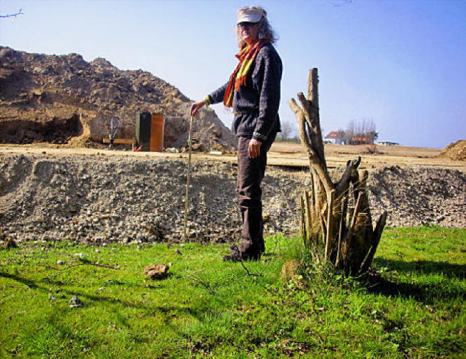 Terrænregulering. Det er fru Skjoldborg, der må agere målepindeholder midt i påskens havearbejde. Bemærk også den ulovligt nedkappede beplantning.