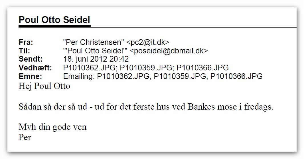 WEBMASTER FIK EN MAIL FRA CHRISTIAN SKJOLDBORG DEN 23. DECEMBER 2011 Kære Poul Otto. Tak for den fine hilsen. Det er 3 flotte billeder. Håber du og konen har det godt. Ang. ombudsmandens svar på husene ved Bankens mose , orker jeg ikke mere. Julehilsen herfra og godt Nyt år. Christian