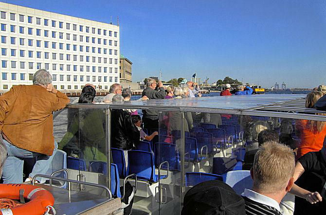| Vi er mange - en hel busfuld - så det tager lidt tid. 30 kroner for en tur. Det er rigeligt prisen værd for lidt over en times sejlads. Et plastbæger "FUT-ØL" koster 50 kroner i Nyhavn. Ikke underligt, at mange handler i køledisken hos den nærmeste købmand og drikker sig en bolværksbajer. |