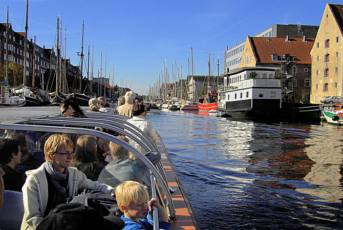 | På vej til havnerundfarten. Vi er nået til Nyhavn, men har dog fået set en hel del af København på busturen ind til staden. Bemærk alle cyklerne. København er blevet en cyklernes by. |