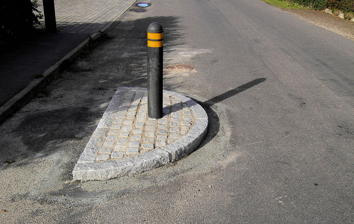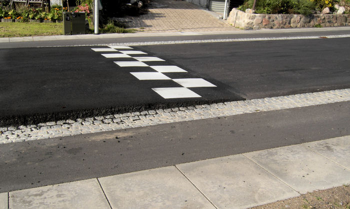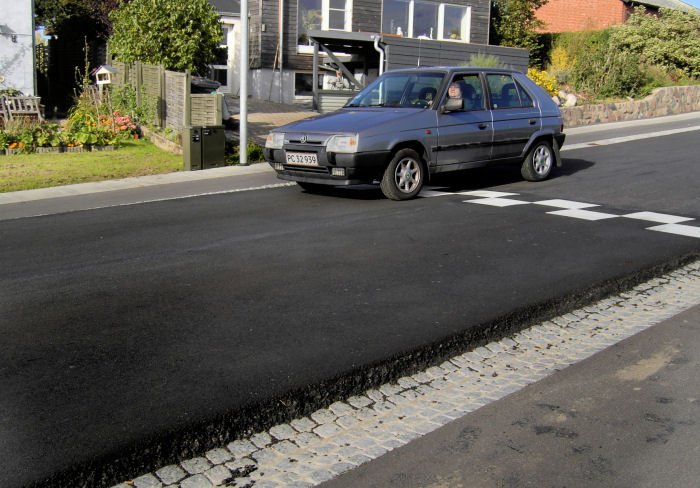 Det nye problem er den højre brostenskant på chikanen. Rammer et forhjul her går det galt. Det kan løses ved at skære kanterne skrå - sådan er det blevet rettet til i Vemmelev og andre steder.