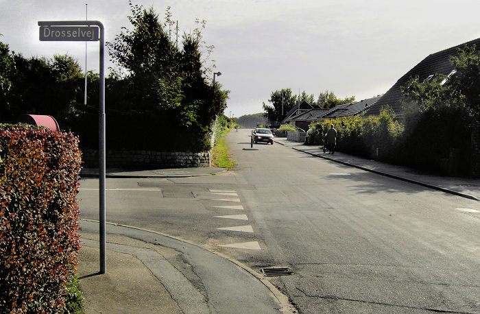 Samme sted vi ser mod vest. Det vil glæde Willy Beck i vor bestyrelse, at oversigtsforholdene nu er blevet bragt i orden. Dem har vi alle hørt dig nævne igen og igen - for mit vedkommende i 15 år. Det blev ikke til et spejl Willy, men til et afskåret hjørne. Ejeren af hjørneejendommen var dog altid villig til at klippe ned.
