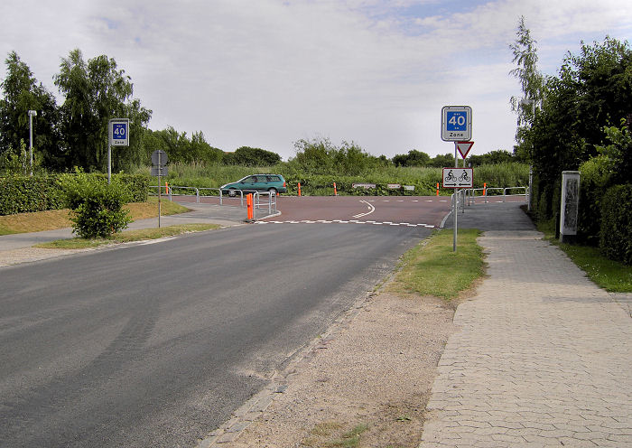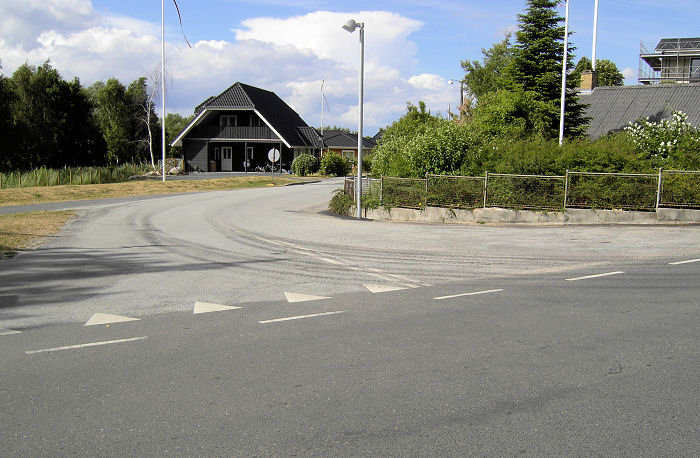 Samme kryds set fra Mælkevej. Man trænger til at beskære beplantningen foran vejskiltene eller anbringe dem noget højere. Ideen med de her stativer og cykeloverkørslen oppe ad vejen foreslog jeg Korsør kommune ved flere lejligheder under min tidligere formandsperiode. Jeg havde set den ved en skole i Marianske Lazné i Tjekkiet og talte om den i tide og utide, så daværende udvalgsformand John Dyrby var ved at "få knopper". Jeg kan ikke lade være med at fortælle det her, fordi Viatrafik har kunnet hæve et kæmpehonorar for løsningen. Uanset hvad - er jeg nu glad for at se "min løsning" virkeliggjort. Samme løsning kunne også anvendes i krydset Rødhøjvej Halsebyvej. Vor forening mener dog, at vi også kunne være tjent med en 40 Km zone på hele Mælkevej.