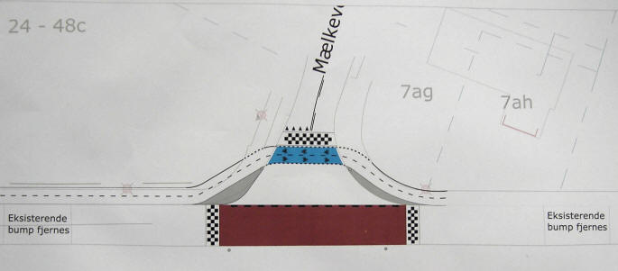 Desværre slipper vi ikke af med den dobbeltrettede cykelsti, men nu kan man ikke bare "suse" lige over krydset, men skal lidt op ad Mælkevej for at passere. Der er tinglyst oversigtsforhold på hjørnegrundene. Vi tror bestemt, at det bliver et væsentligt mere trafiksikkert kryds - det er også tiltrængt. Det er skolevej og her kommer børn via Mælkevej og ad Halsebyvej helt fra Korsør. Bemærk også bumpene som fjernes.