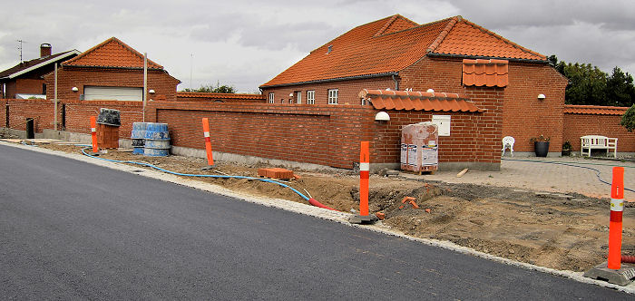 Man kan se, at der er kappet en stykke af muren. Det må have været dyrt for kommunen. Det er en virkelig flot rødstensvilla.