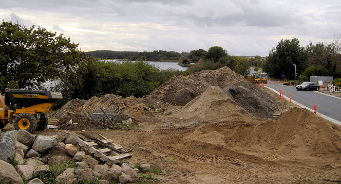 Der er foretaget udgravning og opbygning med grus til vejudvidelse langs bakke.