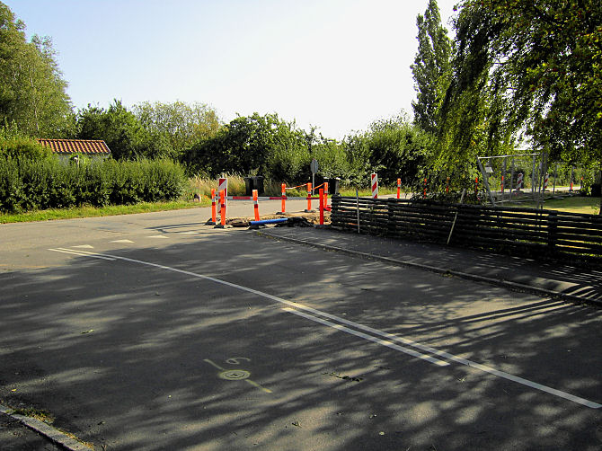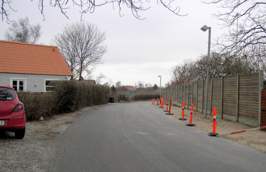 Kig ned mod Rødhøjvej. Tromlerne spærrer, men der er en ganske lille passage.