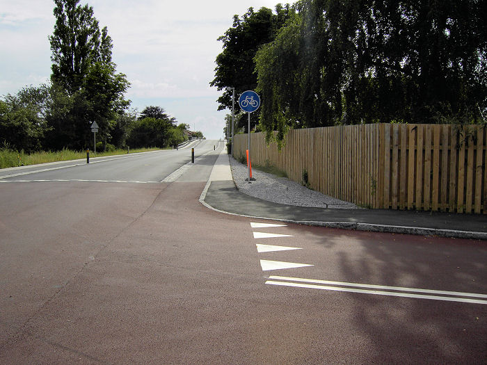 Samme kryds - jeg gik ud på vejbanen og stillede mig i en afstand fra hajtænderne, der svarer til forsædet i en bil. Det er hvad jeg ser - når ser til venstre og har forhjulene helt oppe til hajtænderne. Jeg skal længere frem, for at kunne se op ad vejen efter cyklisterne, som kommer susende ned ad bakken. Lister man langsomt længere frem over hajtænderne, får man dog overblikket. Der her er kun en halv løsning.