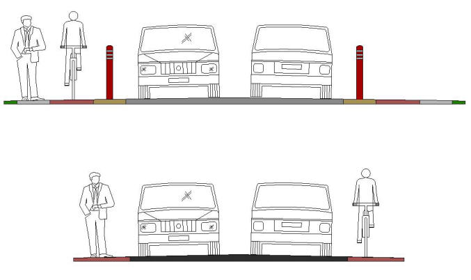 De delte stier fordeles med 0,75 m fortov og 1 meter cykelbane i samme niveau