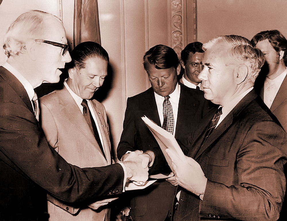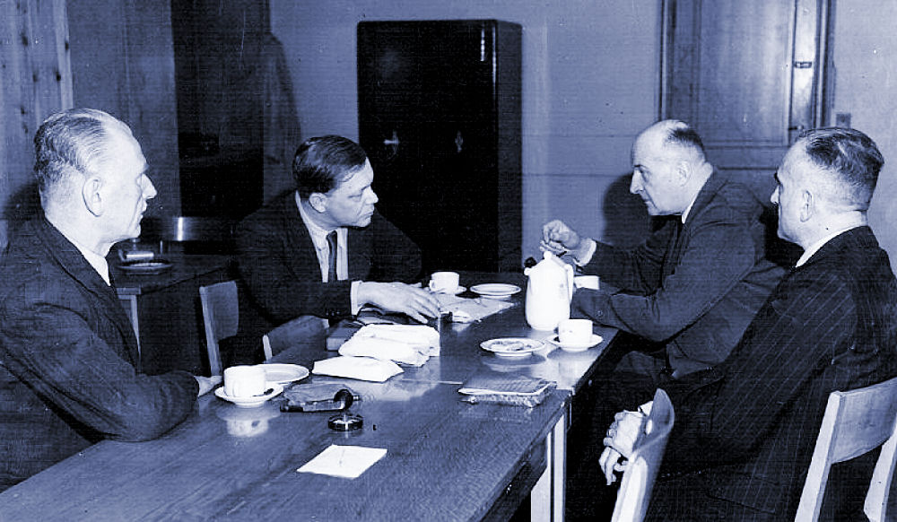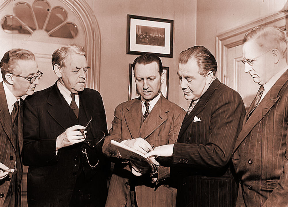 Her på billedet ser du fra venstre mod højre, Alsing Andersen, Vilhelm Buhl, H.C. Hansen, Hans Hedtoft og Niels Busch-Jensen. De var alle særdeles aktive i AIC - Arbejdernes Informations Central. De indtog også centrale poster som statsministre og ministre. De var alle Socialdemokrater. AIC havde som sin hovedopgave at bekæmpe kommunisterne. Vilhelm Buhl sørgede sammen med betroede officerer og den senere general Ebbe Gørtz, at få etableret "den lille generalstab". De sørgede omhyggeligt for, at de våben - især maskinpistoler vi fik fra Sverige ikke gik til de aktive modstandsfolk, men til militærets ventegrupper. De skulle have våbenforsyningerne så de, hvis det kom dertil kunne nedkæmpe kommunisterne. De oprettede også den Danske Brigade i Sverige. En militær politienhed, der kunne sættes ind mod modstandsbevægelsen, hvis den havde til hensigt, at sætte samarbejdspolitikerne fra magten. Det fik et efterspil. I starten af tresserne kunne det i en injuriesag mod dagbladet Land og Folk bevises, at man havde kørt det fordækte dobbeltspil - som fik navnet "den skæve våbenfordeling" og medførte at kaptajn Viggo Hjalf - på det tidspunkt Hærchef - måtte træde tilbage. Det er over 10 siden der skulle indledes en undersøgelse af AIC - vi lægger alt åbent frem erklærede den daværende Socialdemokratiske statsminister Poul Nyrup Rasmussen. Der er ikke kommet meget frem endnu. I besættelsestiden dannede Arne Sejr fra Slagelse Studenternes Efterretningstjeneste. Den fik efter besættelsen kontor i "Buen" ved Frihedsstøtten og fik navnet "Firmaet". Her foretog den emsige tjeneste aflytning, af den kommunistiske formands lejlighed i Langesøhus. En af de medvirkende var den nu afdøde socialdemokratiske forsvarsminister Kjeld Olesen. Det er utroligt, at vi aldrig har fået gjort op med denne selvbestaltede og private spionagevirksomhed og dens registrering af sine medborgere. Dens chikane af medborgere, af anden politisk observans. Dens de-facto berufsverbot indenfor det offentlige og forhindring af karrieforløb. Der lød et ramaskrig i Norge og i Sverige, da de tilsvarende ulovlige efterretningsorganisationers virksomhed kom for en dag. Jeg husker i den tid jeg var ansat i Københavns kommune, at jeg fik det råd at få min partibog i orden ved at melde mig ind i Socialdemokratiet. Jeg fik samtidig af min tillidsmand (han havde været kommunistisk modstandsmand og hans fingre bar tydelige præg af at være knust under afhøringer) det råd ikke at deltage i politisk arbejde, der lå til venstre for Socialdemokraterne. Du får ikke en chance for at avancere uden om systemet og de vil ikke tøve med, at gøre dig helvede hedt. Selvfølgelig kan du avancere efter de regler der gælder herom - du strege ud i den blå personalefortegnelse - og så håbe der opstår en epidemi af en eller anden dødelig smitsom sygdom, men "så kommer du til at skulle vade over lig". Du kan også vælge aldrig, at udtale dig om politik og holde lav profil med din politiske overbevisning. Jeg kunne konstatere, at han havde fuldstændig ret. Min øverste chef var overborgmester Urban Hansen. Ham har jeg oplevet ved et par lejligheder, hvor han prøvede at få mig overtalt til, at undlade at tage pant for skyldige ejendomsskatter i nogle faldefærdige fredede ejendomme på Christianshavn. Jeg lystrede ham naturligvis ikke - det han foretog sig er strafbart. Jeg tænkte mig lige lidt om og tog min afsked og fik job i en omegnskommune. Han havde i øvrigt en form og en optræden, der var så flabet, uforskammet og svinsk, at jeg aldrig har set magen. Ved en lejlighed var nogle gardinarbejdere ikke blevet færdige med at sætte nogle gardiner op i nogle nye lokaler vi havde fået indrettet på Enghavevej. Urban dukkede op og skulle sige os nogle ord. Pludselig opdagede han, at der gik folk og satte gardiner op. Hvorfor er I ikke færdige? I skulle være færdige? Er I vanvittige? Hvis I ikke er færdige i løbet af 2 timer, får I aldrig noget at lave for Københavns kommune mere! Jamen, det firma der skal levere gardinerne er ikke færdige og det kan vi ikke gøre noget ved. Vi er kun gardinopsættere. Det rager mig en pind - de gardiner skal op og det skal være nu! Knyt røven! - sagde gardinarbejderne. Tog deres stiger og ting og gik deres vej. Referat fra DmH´s høring på middelgrundsfortet d. 29 august 2000