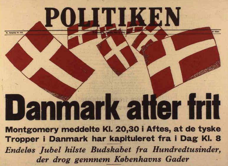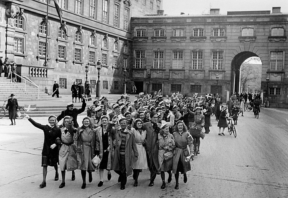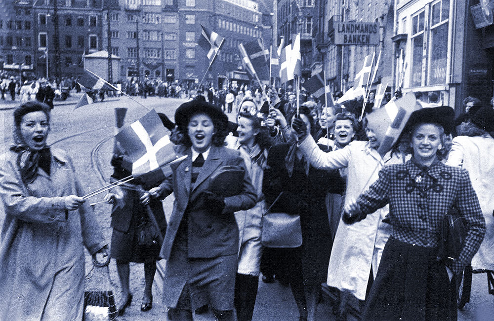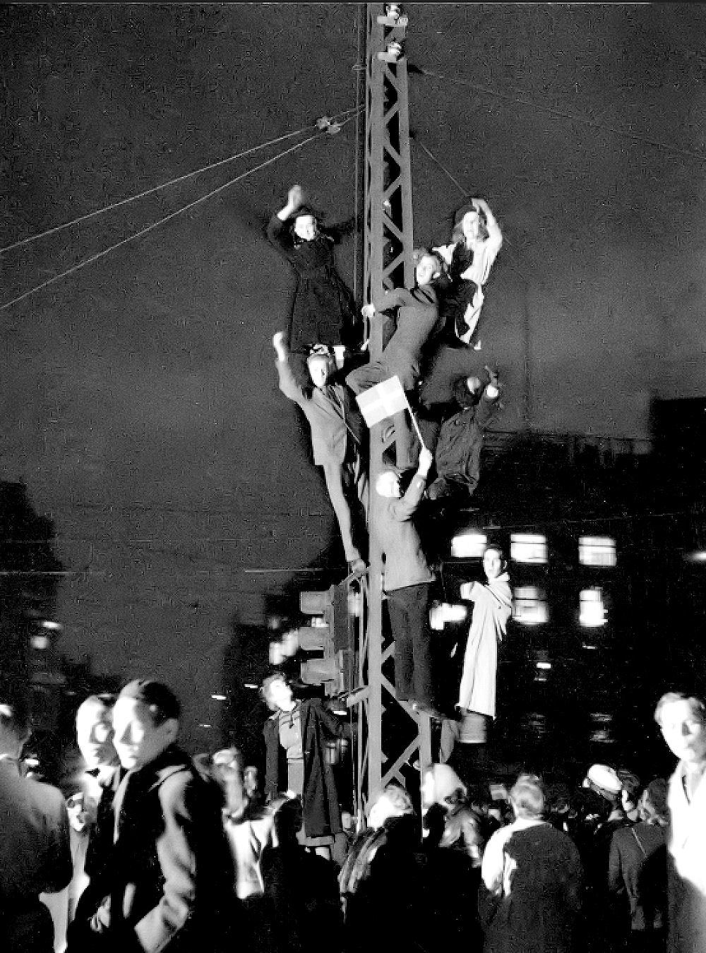 Folk var ellevilde da man fik befrielsesbudskabet. Mørklægningsgardinerne blev revet ned og for at vise, at der var kommet lys over landet igen satte man stearinlys i vindueskarmene. En utrolig smuk tradition, som vi holder i hævd her i huset. Alle festede med hinanden og landet var i en rus her i lyse dejlige forårsdage i maj. Webmaster fyldte 2 år i de dage, men var ramt af dobbeltsidig lungebetændelse og var ved at forlade denne jord i utide. Min far og mor samt mine søstre husker denne aften og dagene derefter. Alle ejendommens beboere samledes hos hinanden og så skålede man i hvad man kunne fremtrylle af "pullimut". Mine søstre fortalte, at de fik besked på at blive inden døre fordi, der var voldsomme skyderier i kvarteret. Her på billedet er folk klatret op i lysmasterne på rådhuspladsen i København. Du kan skimte POLITIKENS HUS i baggrunden. Dette og de fleste af billederne her i dette afsnit er optaget af en ad dette dagblads pressefotografer.