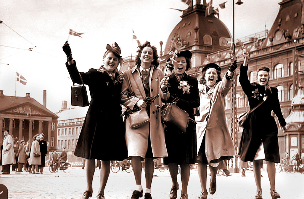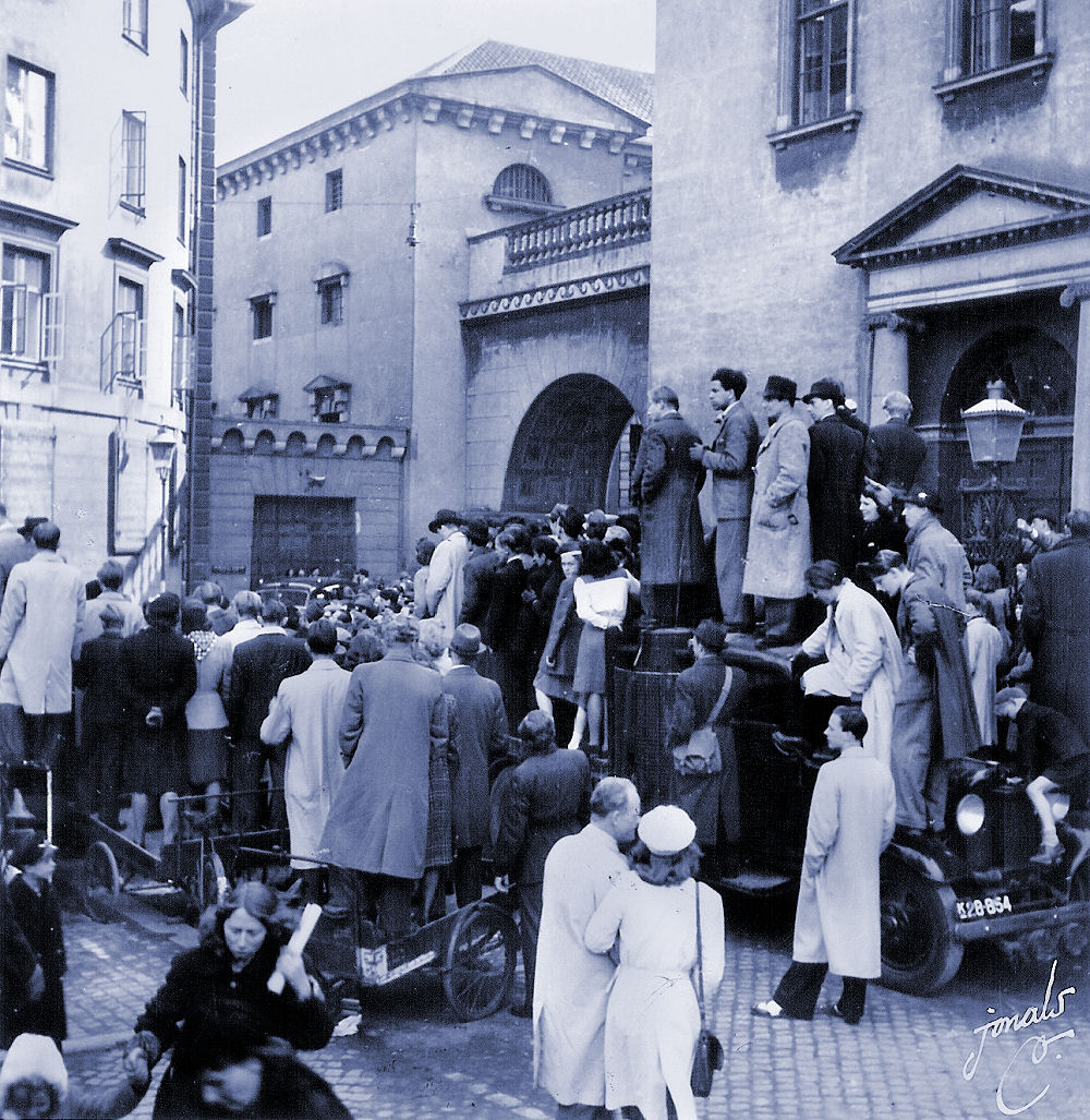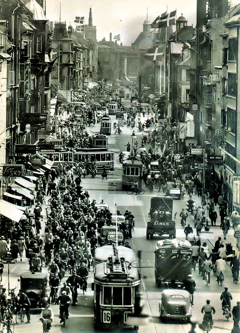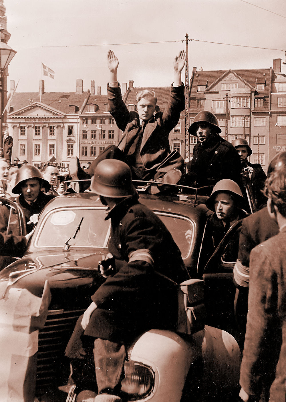 Folk var ellevilde da man fik befrielsesbudskabet. Mørklægningsgardinerne blev revet ned og for at vise, at der var kommet lys over landet igen satte man stearinlys i vindueskarmene. En utrolig smuk tradition, som vi holder i hævd her i huset. Alle festede med hinanden og landet var i en rus her i lyse dejlige forårsdage i maj. Webmaster fyldte 2 år i de dage, men var ramt af dobbeltsidig lungebetændelse og var ved at forlade denne jord i utide. Min far og mor samt mine søstre husker denne aften og dagene derefter. Alle ejendommens beboere samledes hos hinanden og så skålede man i hvad man kunne fremtrylle af "pullimut". Mine søstre fortalte, at de fik besked på at blive inden døre fordi, der var voldsomme skyderier i kvarteret. Her på billedet er folk klatret op i lysmasterne på rådhuspladsen i København. Du kan skimte POLITIKENS HUS i baggrunden. Dette og de fleste af billederne her i dette afsnit er optaget af en ad dette dagblads pressefotografer.