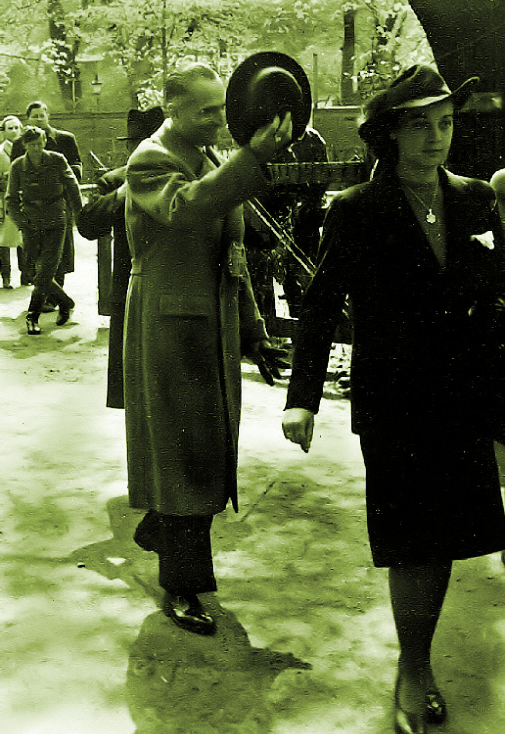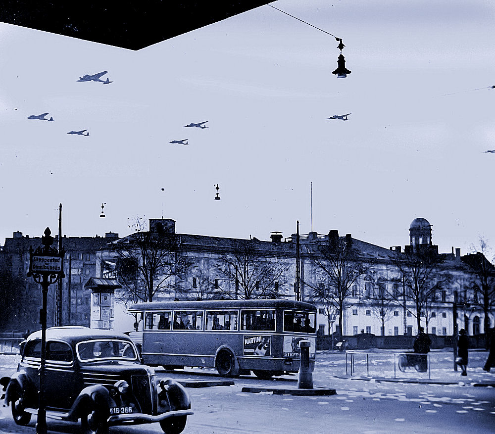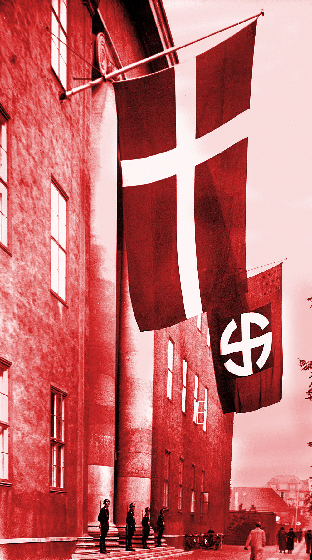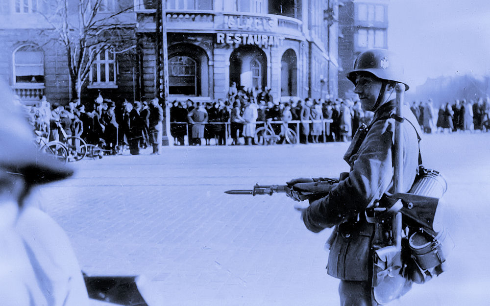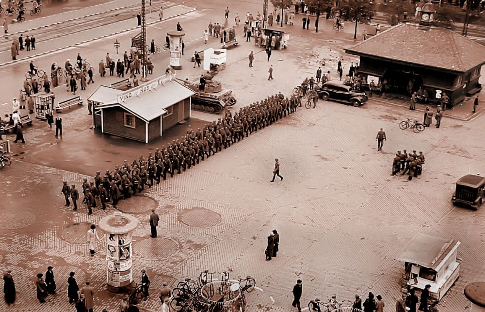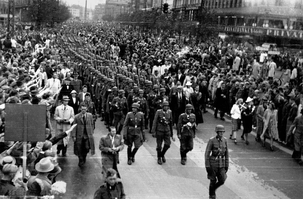 Et opbud af takt. Tyskerne holder parade på Rådhuspladsen i København. Det er sporvejenes trafikvagt du ser oppe i øverste højre hjørne.