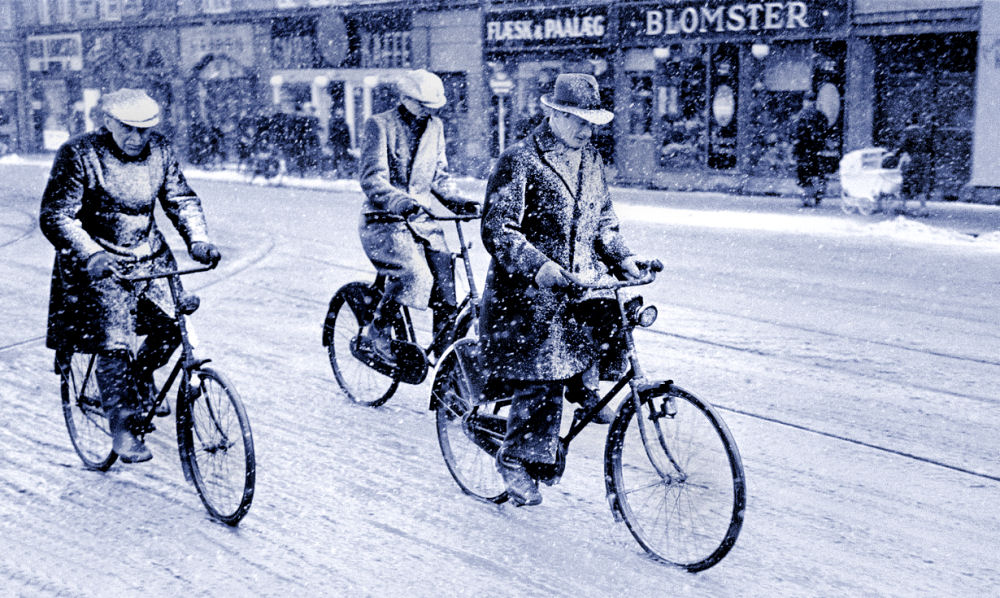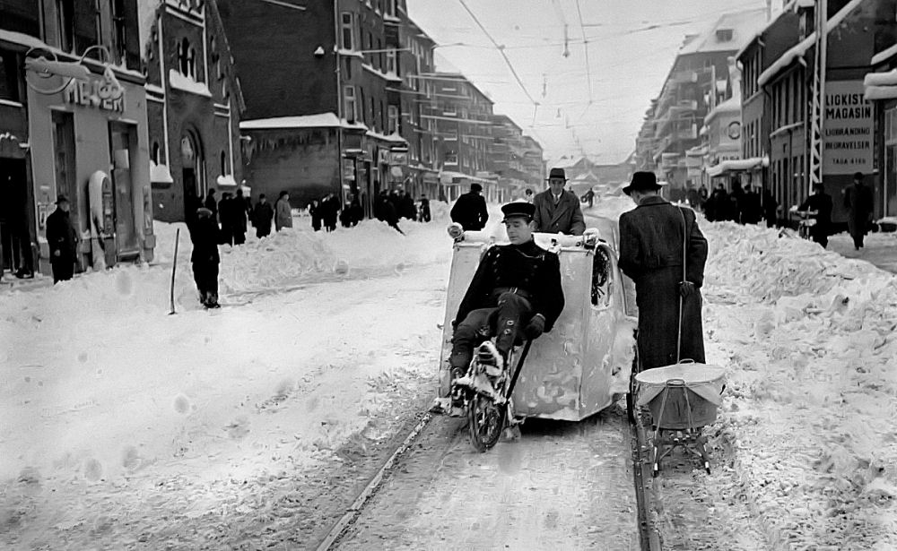 Her et herligt billede af en cykeltaxa. Pedaltræderen er iklædt uniform og kasket. Der var nogle rigtig kolde isvintre i nogle af besættelsesårene. Vi manglede brændsel og drivmidler "... det er en kold tid og alle går rundt og fryser ...". Billedet er fra Frederikssundsvej og jeg tror vi ser ind mod Nørrebro Station. Kun sporvognskinnerne er ryddet for sne og fortovene. Jeg synes det er en opfindsom herre, der har fremstillet sig en lille trækvogn af en vaskebalje monteret på et barnevognsstativ. Bemærk også at alle bær hovedtøj.