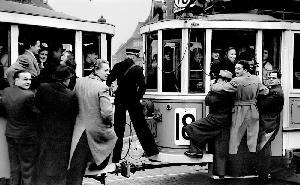 Sporvognene var så overfyldte, at man måtte hænge uden på. Det har jeg selv prøvet, da jeg arbejdede i Skattedirektoratet i Gyldenløvesgade. Først tog med linje 3 fra Enghavevej til Åboulevarden. Her var sporvognene så overfyldte, som ovenfor. Kom man ombord, skulle man gå frem i vognen. Ja, den var fin: Nu stod man halvvejs nede i vognen og kunne ikke komme af selv om man skreg i afmagt, jeg skal af, jeg skal af, hvor jeg skulle. Det blev først nede ved Nørreport Station og så kunne jeg gå tilbage. Det fis prøvede jeg en måned. Så løb kortet ud. Så lånte jeg penge af min far til en Velo Solex knallert, så jeg kunne købe den kontant, som jeg fik 15% rabat på hos URANIA cykler på Gl. Kongevej 1. I løbet af et halvt år var den knallert tjent ind og min far fik lånebeløbet i løbet af 2 måneder, og så var det meget hurtigere. Knallerten kunne dog ikke køre i sne. Det var en rulle, der trak på forhjulsdækket og sneen satte sig i klemme så rullen gled. Man kunne godt cykle på den, men den var så lavt gearet, at man fik knopper af det. Så gik jeg bare i stedet for. Den havde også den fordel, at jeg kunne køre på den i kontortøj og være pænt klædt på. Jeg kørte også motorcykel og scooter, men det var senere.
