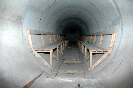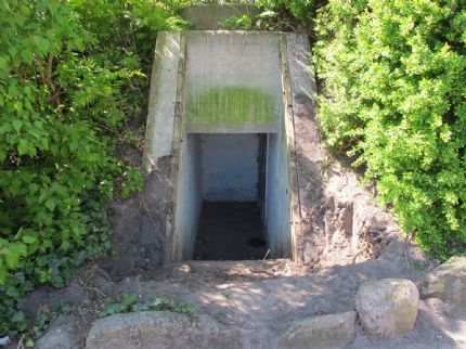 LEGEPLADS PÅ KRIGENS DYSTRE EFTERLADENSKABER Her er et billede fra min barndom. Disse bunkers fra besættelsestiden varede det år og dag, at få fjernet. Vi brugte dem til legeplads, derfor er græsbevoksningen slidt helt bort. De blev senere anvendt til eksempelvis kartoffellagre og lignende. De var næsten altid forsvarligt aflåst. Disse bunkers havde nogle huller i murværket foroven. Vi forstod ikke hvorfor de gik ind på skrå; og skænkede ikke den dystre baggrund for deres eksistens en tanke. Ved mine forældres kolonihave på Gammel Køgelandevej, lå der lige overfor Persil´s vandtårn ved siden af Carl Jacobsens vejs forlængelse på den anden side af vejen i selve kolonihaveområdet et par bunkers. De var aflåst. Engang brækkede jeg og mine legekammerater dem op for at se hvad de indeholdt. De var cirkulære indvendig og langs ydermuren var der primitive bænke i fyrretræ. Der var etableret nogle små aflukkede båse, med et bræt med hul i, som toiletter. Under hullet var en stor metalspand med håndtag. Der var et par aflåste skabe, dem brækkede vi op. Her var et mindre lager af sække, skovle, lommelygter, brækjern, gasmasker med et stort lager af reservepatroner. Stabler af hvide papskilte med sorttrykte påtrykte tekster i form af pile, beskyttelsesrum, adgang forbudt, eksplosionfare og videre i den dur. Gulvet i rummet var cement. Der stod lidt vand i pytter. Det rungede når vi talte sammen. Der kom et svagt lys fra oven fra de der huller i de kasser der var ovenpå og så fra døren vi havde åbnet. Her var dystert, klamt, mørkt og en uhyggelig stemning og en kedelig lugt af mug. Vi gik aldrig herned igen - når jeg siger ned, var det fordi vi skulle ned ad en skråning oppe fra vejen for at komme til indgangen. Vi kunne have anvendt beskyttelsesrummet som hule, men det følte vi ingen trang til.
