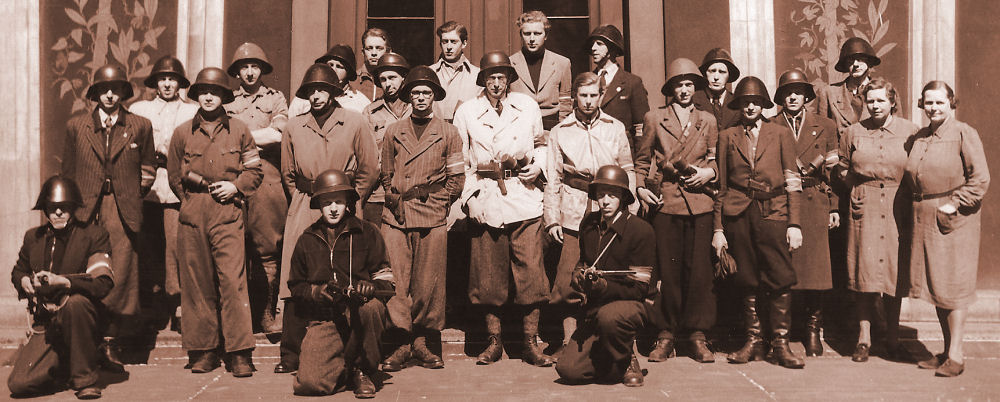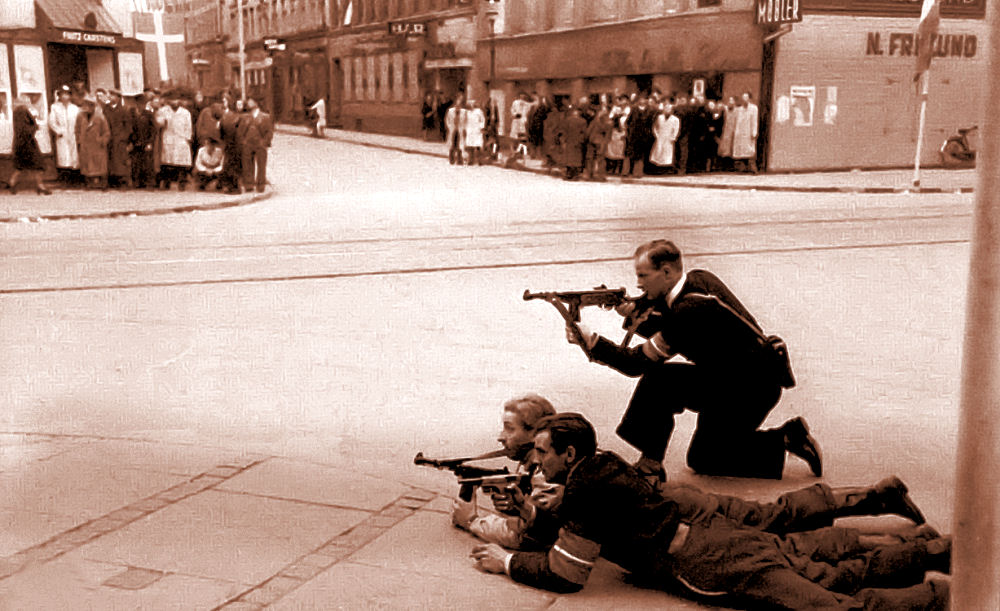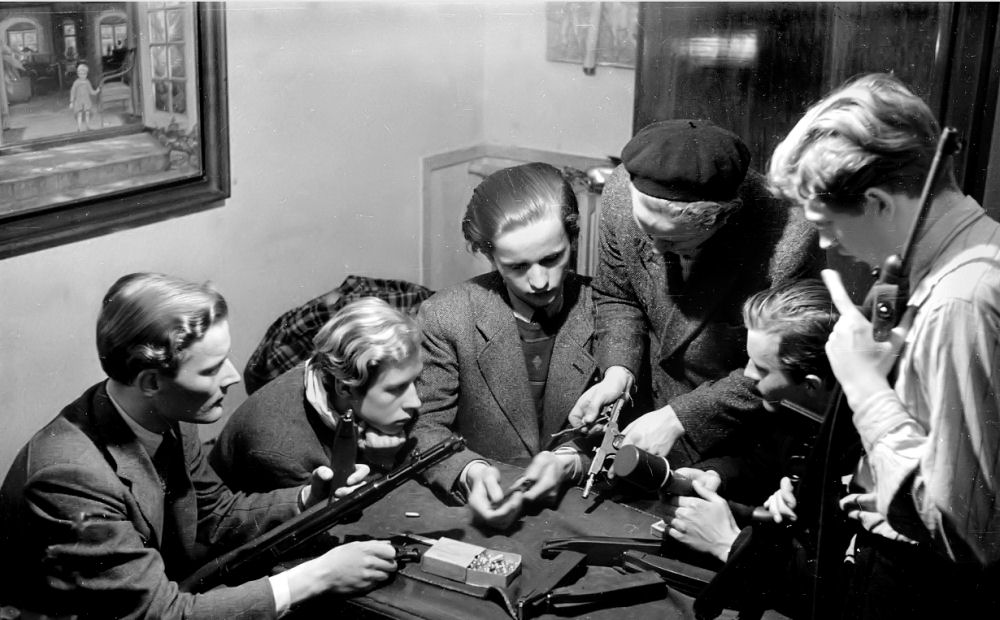 Modstandsfolk, frihedskæmpere undervises i våbenbrug. Billedet er et modelbillede optaget efter befrielsen. Ingen var så tåbelig at lade sig fotografere i den situation under besættelsen. Våbnene er ikke så interessante. Det er derimod deltagernes alder. Det var ganske unge mennesker der ikke lod stå til og gik aktivt til modstand med livet som indsats. Det er disse unge mennesker vi har at takke for, at Danmark blev anerkendt som allieret. Senere startede Socialdemokraterne en kampagne imod dem kaldet "MODBEVÆGELSEN", der skulle nedgøre deres indsats og fremhæve de sande patrioter, nemlig dem der for at skåne landet fra det der var værre havde samarbejdet med tyskerne. De var de sande kloge der havde reddet landet. Samme socialdemokrater lod fremstille 50.000 frihedskæmperarmbind, som de tog på efter befrielsen. De fik i folkemunde betegnelsen "De sidste dages hellige". Socialdemokraterne begyndte nu også en hetz mod modstandsbevægelsens stikkerlikvideringer, som var foretaget i nødværge. Nu kaldte man dem ondskabsfuldt for mord. Frihedskæmperarmbindet blev fremstillet af den danske hær, fordi man ville være i den situation at danskere i det militære ventegrupper og i modstandsbevægelsen kunne komme i væbnet kamp med tyskerne. Det ville være umuligt at komme i uniform. Dette armbind viste, at man var kombattant og derfor var berettiget til at blive betragtet som soldat og beskyttet efter de regler der gælder for soldater i krig. Da de allierede rykkede frem i Tyskland, var der en hel del tyskere der kæmpede uden uniform. Hvis de blev taget som fanger, blev de skudt på stedet. Tyskerne var så desperate, at de lod soldater i civil påklædning snige sig ind på fjenden for at nedkæmpe den (ofte som snigskytter). Armbindet var i øvrigt fremstillet af gamle blå uniformsbukser.