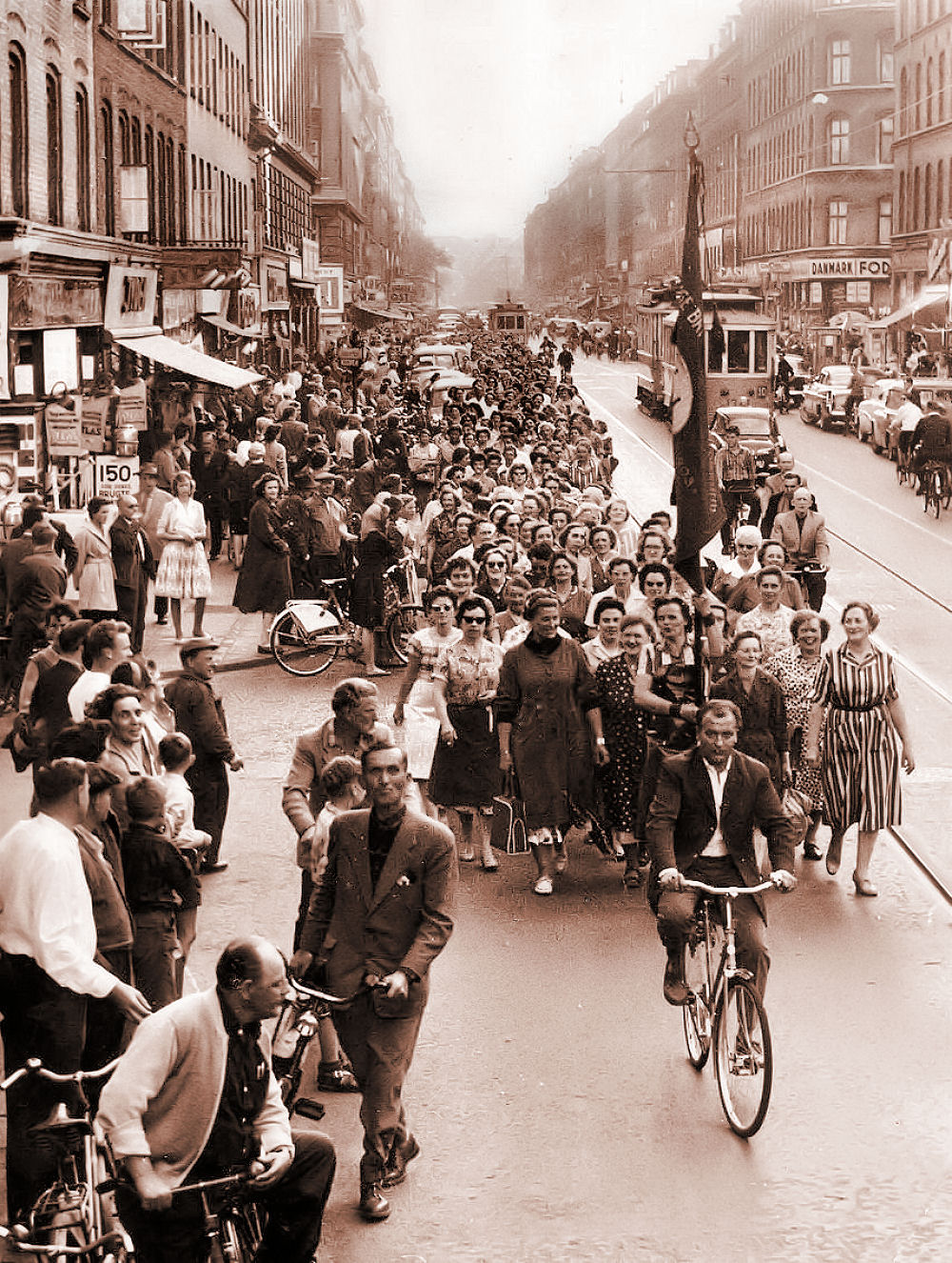 (juni 1960 - kvinder fra Carlsberg Bryggeriet på vej gennem Istedgade på Vesterbro i København til en demonstration - billedet viser, at kvinderne i løbet af halvtredsserne er kommet ud på arbejdsmarkedet fra kødgryderne derhjemme og har lært at stå sammen og være solidariske og ikke er blege for at slås for deres rettigheder. Mændene på Carlsberg havde fået et timelønstillæg, det havde kvinderne ikke - selv om de udførte samme arbejde. Det blev til en strejke på 14 dage. Så fik kvinderne samme tillæg.) Som stor knægt havde jeg været så heldig, at få lov til at overtage en af min fars jødiske venners søns budplads. Det var som at vinde i lotteriet. Lige her til venstre i billedet lå den butik jeg skulle arbejde i efter skoletid. Det var en kombineret Viktualie- kolonial- og kaffeforretning og den hed "Røde Mølle". Der var en hel kæde af disse butikker i København. Den jeg arbejdede i, lå i Istedgade lige ved Skydebanegade. Det gav i starten 25 kr. om ugen og til sidst 35 kr. om ugen. Jeg havde cirka et tilsvarende beløb i drikkepenge og jeg kunne endvidere købe alle varer i butikken med 40% rabat - der blev også solgt slik, men det delte den kvindelige bestyrer rigeligt ud af. Jeg holdt meget af orange-trøffel, marcipanbrød og nogle små cremefyldte stænger der hed "Store Claus". Det var mest chokoladevarer man førte.