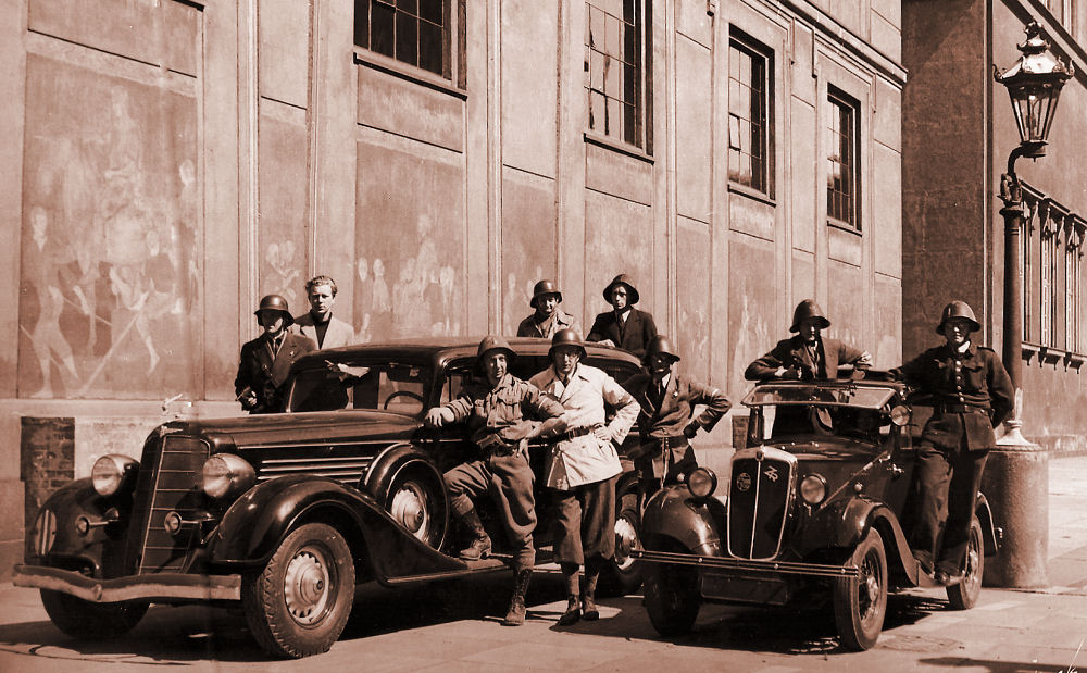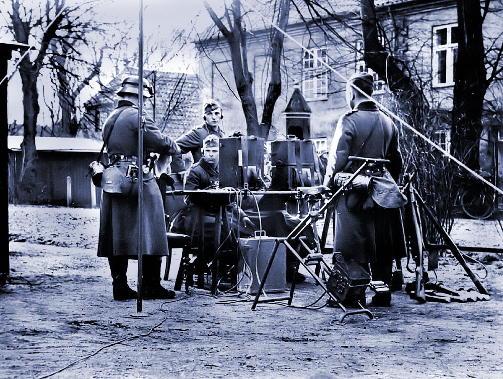 Her har vi den radiogruppe, som tyskerne bragte med på Hansestadt Danzig til København. De har etableret sig i Kastellets gård og deres opgave var, at sørge for radioforbindelse til en tilsvarende gruppe, der var gået i land i Korsør - så man via denne kunne få forbindelse til et Hotel ved Alstersøen i Hamburg, hvor hele planen for overfaldet på Danmark var blevet planlagt i dybeste hemmelighed. De havde også bredt et tysk flag ud på jorden, så flyvemaskinerne på den måde kunne se, at man havde indtaget Kastellet. Deres vigtigste opgave var, at få givet besked om hvorvidt Danmark havde overgivet sig. Hvis danskerne tøvede for længe havde man mulighed for at kaste nogle bomber over København for at fremme overgivelsen. Man havde dog ikke kunnet tæppebombe København, det havde man simpelthen ikke kapacitet til, men nogle få bomber de rigtige steder kunne sagtens have tvunget os i knæ. Jeg er selv uddannet som radiotelegrafist ved militæret, så jeg kan se at de har rejst en mast af stænger - der er nok 3 stk. i alt, så man har kunnet lave en zepp-antenne med 15% udtag. Jeg kan se nedføringen til den ene sender. Det giver en glimrende antenne til 100 - 60 meter båndet. København/Hamburg kan være drilsk at holde forbindelse til hele døgnet. Korsør som ligger 100 kilometer væk, kan man næsten med sikkerhed klare døgnet rundt. Læg i øvrigt mærke til stativet i forgrunden med sadel og pedaler. Her man sætte en slave til at trampe rundt, så generatoren kan lave strøm til anlægget.
