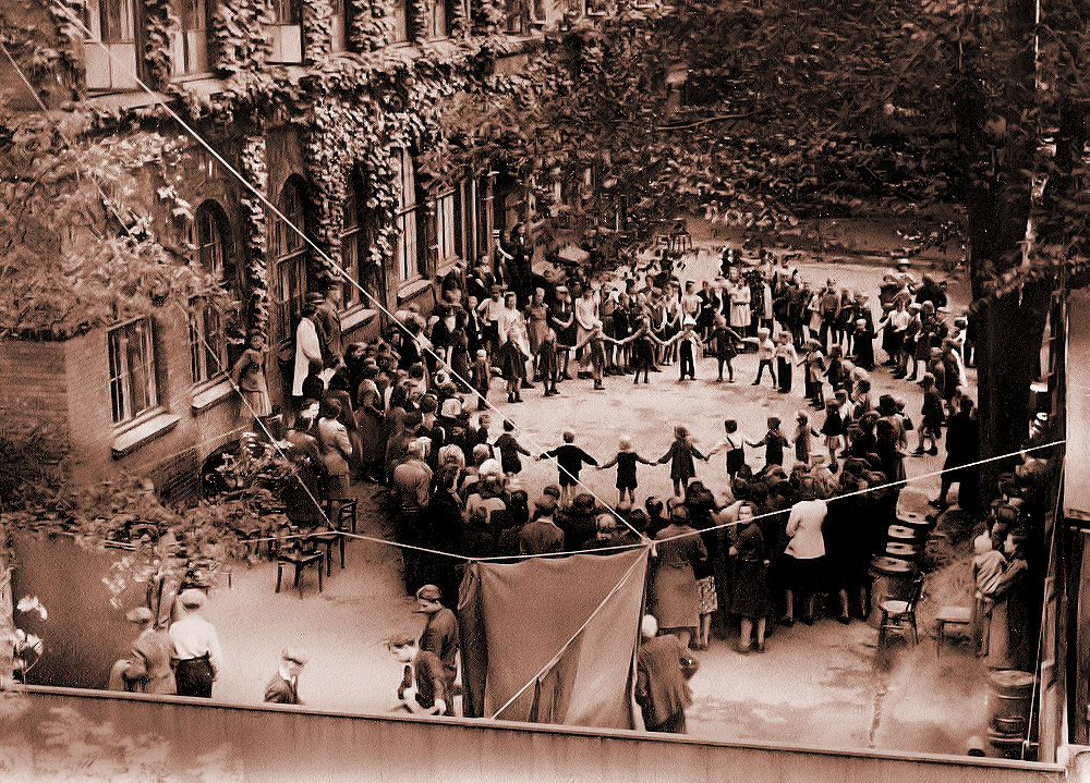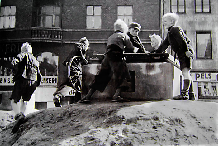 DÅRLIGT TØJ OG HJEMMELAVET LEGETØJ Bemærk vor påklædning, de dårlige sko, plus-fours´ne, hvor elastikken altid gik i stykker så de hang i "ål". Ankelstrømper - der altid gled ned. Jeg erindrer fra min skoletid i de små klasser, at mange af mine klassekammerater gik i brune gummisko fra Codan - ofte uden strømper eller sokker. I vintertiden var det ofte brune gummistøvler. En fodbeklædning der gav iskolde fødder og førte til, at utroligt mange børn vintertiden igennem rendte rundt med evig snotnæse. Snotten drev ud næseborene og man sugede lige det værste væk engang imellem med underlæben. Blev det for slemt tørrede man sig lige med et trøje, jakke- eller frakkeærme. Jeg og de fleste andre børn var udstyrede med strikkede halstørklæder, vanter og strikhuer. Min mor havde udstyret mine vanter med en elastik fra vante til vante. Den gik og gennem det ene jakkeærme og ud af det andet. Så blev de ikke væk. Jeg har en frygtelig erindring fra min allertidligste barndom. Jeg havde taget vanterne af en bidende kold vinterdag og ville gå ned ad en lille cementrappe til kældergennemgangen til gården. Jeg var så lille og mine ben så korte, at jeg måtte holde i et bøjet vandrør som blev brugt som gelænder. Pludselig hang min hånd fast i gelænderet - jeg havde taget vanterne af, fordi de var blevet våde af at lave snebolde. Det var så koldt at min hud frøs fast til gelænderet. Jeg skreg og hylede i vilden sky. Man blev nødt til at hive min hånd af jernrøret så huden blev siddende. Min far holdt et lille pædagogisk foredrag for mig og mine søskende, han fortalte at det var så koldt, at vi skulle holde vore huer nede over ørene ellers risikerede vi, at vi kom op fra gaden og den bidende kulde og ind i varmen og vi pludselig rørte ved vore øreflipper, at de faldt af fordi de var blevet stivfrosne. De kunne vi ikke mærke, at de frøs. Næsetippen kunne også fryse af. Min mor kunne ikke lide det her, så hun anskaffede fluks en hue til mig med øreklapper og spænde ned om hagen. Så kunne jeg til gengæld ikke høre en dyt. Jeg føler mig overbevist om, at andre kan nikke genkendende til denne episode og givet har haft lignende oplevelser. Vort legetøj var typisk et sådant cykelhjul - som du ser på billedet - fra en skrællet cykel. Vi brugte også kasserede gasmasker og hjelme. Der havde været oprettet et civilt karreværn under besættelsen, de havde haft de her ting og nu blev de kasserede. Så legede vi nazister, hipoer og frihedskæmpere udstyret med træpinde, som imaginære skydevåben. Vi brugte kælderrum og cykelskure som fængsler. Vi havde næsten altid et stykke sejlgarn, så man kunne binde fangerne. Der gik vilde rygter blandt os børn om, at Hitler - som vi ikke kendte, men som måtte have været en virkelig slem fyr - slet ikke var død, men var undsluppet i en robåd. NYE SKÆLDSORD OG DEN KOLDE KRIGS LEDE ANSIGT Der dukkede også et nyt skældsord op blandt os børn, det var "kommunistsvin" - vi vidste ikke hvad der lå i det, men det blev brugt - det lød dumt og gled hurtigt ud. Jeg erindrer også tydeligt fra dengang, at vi havde to-minutters stilhed den 9. april i skolen. Jeg undrede mig også over, hvorfor der midt ude på kørebanen pludselig blev lagt blomsterbuketter, som cyklisterne pænt kørte uden om. Det står også tydeligt i min erindring, da vi fejrede 5 året for befrielsen. Her hang det engelske, det amerikanske og sovjetunionens (vi sagde det russiske) flag ligeværdigt side om side i stor størrelse hen over gaderne på snore som udsmykning. Der blev uddelt små og store papirsflag - alle tre slags - som vi samlede og viftede med. Senere gled det russiske flag ud. VÅBEN OG BRAND I GADEN Køller af kasserede juletræer var gode at have, hvis fjenden fra nabogaden dukkede op. De blev kun brugt som trussel, nok sloges vi drenge indbyrdes, men vi var ikke voldelige og man kunne sagtens redde sig en blodtud eller en skalle, men det gik nu ikke så vildt til, at nogen kom til skade og slet ikke med køller. Man kunne også lave bål af dem i gaden - så kom brandvæsenet og sprøjtede lidt vand på - straks de var væk, tændte vi et nyt. Vi havde også brændeglas og skrællede alle cykler, vi kunne komme i nærheden af for celluloid. Det gav den herligste tykke stinkende osende røg, når man antændte det med brændeglasset. Utroligt at vi ikke har reddet os en røvfuld. Slangebøsser fremstillede vi af en bukket cykeleger og elastikken blev gjort af en kasseret cykelslange. Ammunitionen var papirskugler eller småsten. Det var i øvrigt utroligt, hvad der kunne være af vand i en sådan kasseret cykelslange. Vi havde vandposter i gårdene til at skylle skraldespande med - så vand var en fri ressource. Mindre bolde blev fremstillet af kasseret madpapir, der blev rullet til en stor fast kugle omviklet med elastikker. Så kunne man spille fodbold med den i skolegården i det store spisefrikvarter. Vi havde også pusterør - det var blot et stykke klart plastrør. Ammunitionen var halve gule ærter. EN LÆRER MED PÆDAGOGIK Vores regnelærer havde et system - som sikkert også kan bruges den dag i dag. Når man havde lavet sin hjemmeregning, fik man karakter for udført arbejde, ved at få tildelt nogle små mærker med lim på (det var mærker, der blev brugt til at lukke rullede festsange med). Det fineste var guldstjerner, men der var også sølvstjerner, grønne kløvere. guld- og sølvhestesko og røde hjerter. Det allerfineste ved det, var at de bedste til regning fik deres guldstjerner, men de ringeste fik også mærker for, ikke have visket for voldsomt ud, have fine velspidsede blyanter og have undgået at lave æselører på kladdehæftet eller skrevet tallene læseligt og have orden i det hele eller hvad han nu lige fandt på - så alle fik en side med strålende mærker. Det indebar at ingen blev tabere og at alle kunne tabellen op til 20. Han arrangerede en tabelkongekonkurrence i slutningen af h