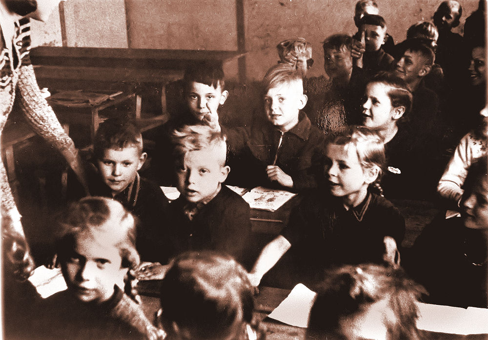 Børnene på billedet, som man forsøger at give lidt opmuntring på en skole, hvor man er blevet indkvarteret er på min egen alder. Hvordan gik det dem senere i livet? Det ville jeg gerne vide. Her var ingen krisepsykologer, selv om der nok var en hel del der havde behov herfor. Jeg har en god ven. Han kom til Danmark som flygtningebarn fra Tyskland. Han er 2 år ældre end jeg. Han blev senere civilingeniør hos Siemens i Danmark med speciale i laser- og lyslederteknik, men er nu pensioneret. Engang drøftede jeg sammen med en flok venner, hvor lidt vi faktisk kunne erindre fra vore første leveår. Det er ikke sandt sagde Wolfgang. Jeg husker i krigens sidste måneder et luftangreb på Kiel, hvor de allierede bombede havnen og de ubåde der lå her. Min mor tog mig med ned i kælderen i den ejendom, hvor vi boede, da sirenerne begyndte at hyle - en lyd jeg aldrig glemmer. Så stod vi i kælderen. Min mor med mig på armen i vand til livet. Vi havde kun sparsomt lys. Der lugtede af gas, så lyset blev slukket. Vi hørte hylene fra bomberne der faldt. Det bragede med buldrende drøn og rystelser nede i kælderen omkring os, for vi boede tæt på havnen. Jeg erindrer ganske tydeligt denne oplevelse og i sær de skælv af angst, der gennemrystede min mor, da hun hørte bomberne hvine imod os. Jo, der er ting vi husker ganske tydeligt - det afhænger blot af, hvad vi har oplevet. Jeg har stadig - sagde Wolfgang - tydeligt bevæget - ofte mareridt, hvor jeg gennemlever det her. Russerne bomber Rønne og Neksø