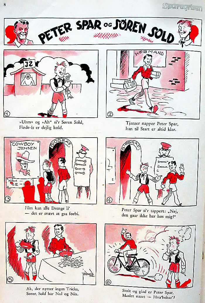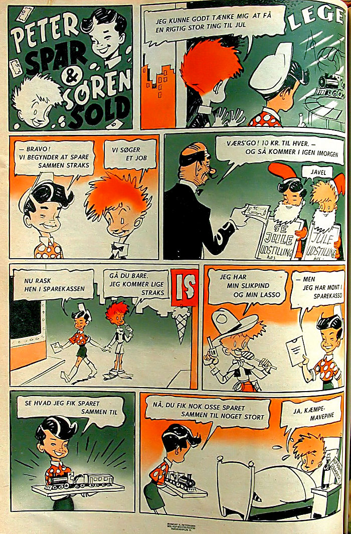 Her den første fra 1932. Den moral er ikke lige sådan at sælge til normale drenge.  Så en fra 1952 - man pyntede lidt på Søren i tidens løb. Det er versionen fra 1952 jeg kender. Jeg fik lettere kvalme af den Peter. Han virkede lidt som en fedtsyl. Den bar navnet PETER SPAR OG SØREN SOLD. Den førstnævnte dreng, havde sorte krøller og var så ren og pæn og fornuftig og sparsommelig - han lignede en hel fætter Højben. Den anden lignede os andre. Han var mærkelig i tøjet, havde rødt strittende uredt hår og brugte alle sine penge på slik - især isvafler. En rigtig rod og lidt af en slapsvans uden rygrad. Ham holdt vi af og kunne identificere os med. Der blev ikke købt mange sparemærker. Utroligt, at den form for reklame kom ind i skolerne. NU SKAL VI AMERIKANISERES MED SÅKALDT AMERIKANSK POPKULTUR - ET FREMSTØD I DEN KOLDE KRIG