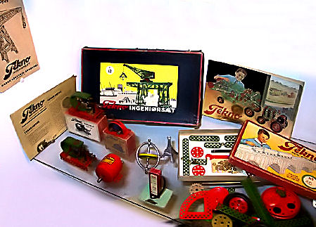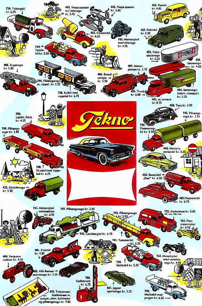 Bilerne er blevet samleobjekt i dag og når svimlende priser. Dette er fra en plakat, der kunne hænge i legetøjsbutikkens vindue, så kunne man gå og drømme til man fik råd. Det var også et katalog - bemærk de høje modelnumre - der var vitterlig mange modeller. Jeg erindrer at have haft motorcyklen med sidevogn i sort og solomotorcyklen i mørkeblåt og Carlsberg-bilen. Den gamle rystende FÆR-GUUH-SON traktor har også været i mit eje. Den havde jeg jo set på Bellahøj til det årlige dyrskue, hvor det var let at finde ud med linje BUH - sporvejene udstyrede en sporvognslinje med et skilt med et kohoved i stedet for et linjenummer - så kunne også børn finde ud af det. Jeg har også siddet på en sådan - de var udstillet i lange rækker derude, men jeg kom der for dyrenes skyld, for her var dyr man måtte røre ved. I min barndom var Danmark et landbrugsland. Det firma der lavede teknobiler lavede også en hel del andre rare sager - her er de: