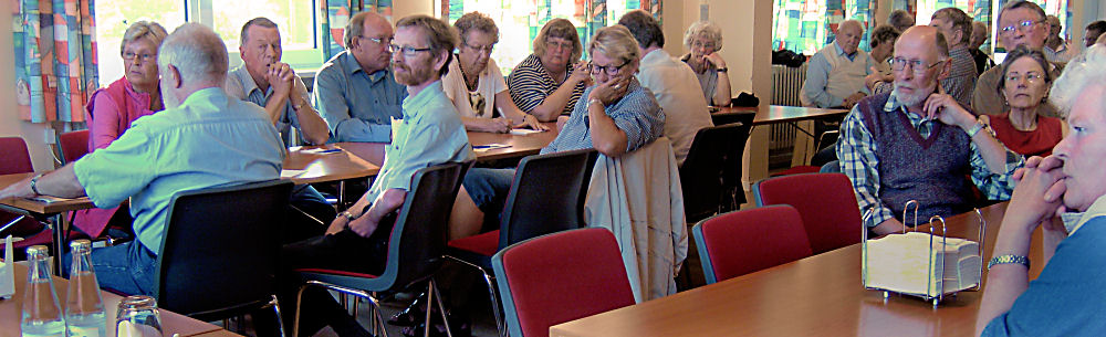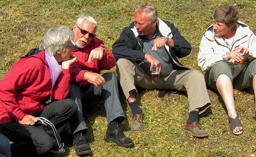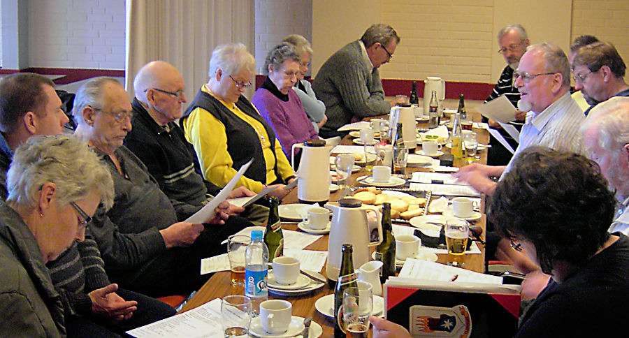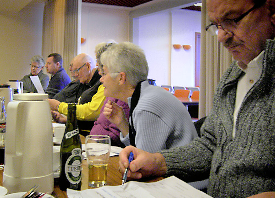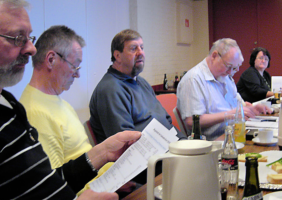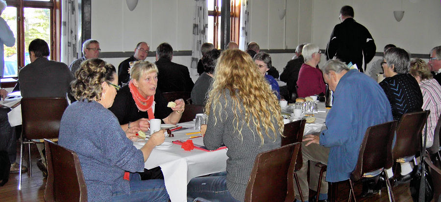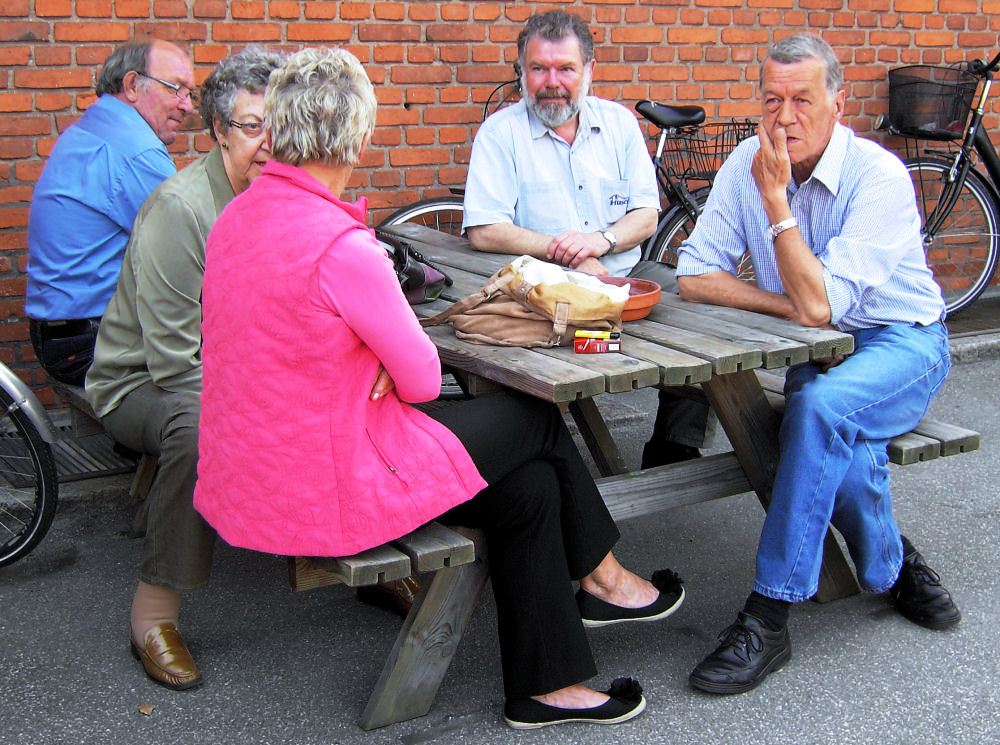 Mødedeltagerne spiser morgenmad. Vi tog turen derud over Tårnborg, Tårnholm, Hulby, Stude og Erdrup - men det blev med omkørsel over Halkevad og Flakkebjerg stationsby, fordi en del veje var lukket af politi og hjemmeværn. Årsagen var afvikling af motorløb på vejene. Vi hørte disse biler - det lød som om de manglede udstødningen. Det var et pragtfuldt vejr og man kommer rigtigt på landet, når man skal helt til Gimlinge. Heldigvis var der indfødte vi kunne spørge om vej - så vi måtte over Halkevad. Der tales en særlig dialekt på egnen: Eksempelvis hedder sætningen "min morfar var bager på Agersø" - "min måfar var bawwer på Aarh-ar-sø". Det er jo rigtig hyggeligt. |