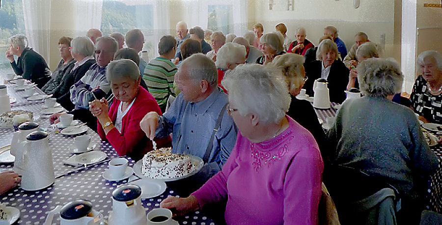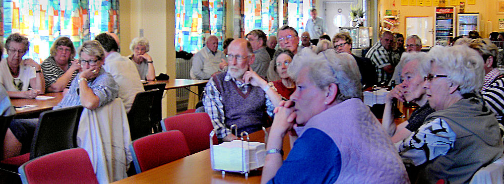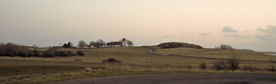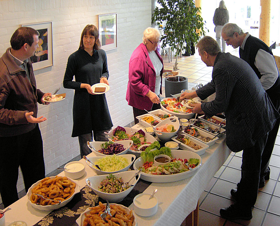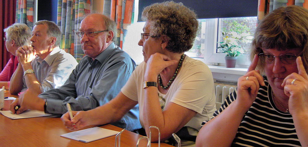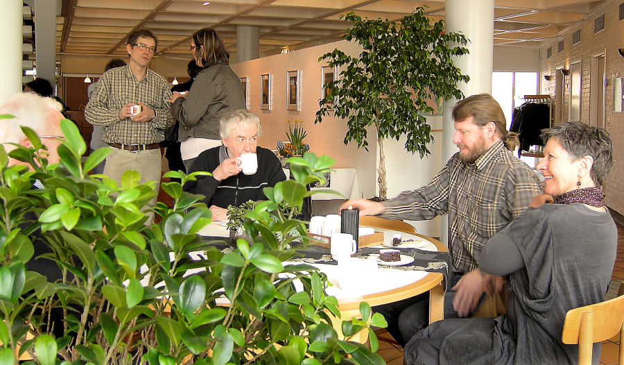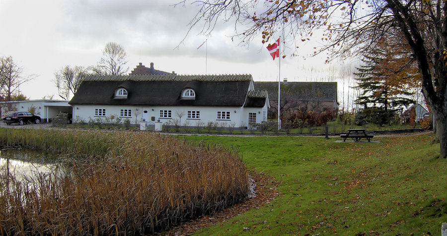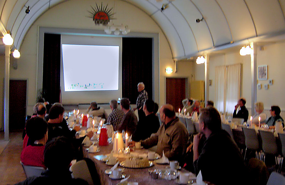 Mødedeltagerne spiser morgenmad. Vi tog turen derud over Tårnborg, Tårnholm, Hulby, Stude og Erdrup - men det blev med omkørsel over Halkevad og Flakkebjerg stationsby, fordi en del veje var lukket af politi og hjemmeværn. Årsagen var afvikling af motorløb på vejene. Vi hørte disse biler - det lød som om de manglede udstødningen. Det var et pragtfuldt vejr og man kommer rigtigt på landet, når man skal helt til Gimlinge. Heldigvis var der indfødte vi kunne spørge om vej - så vi måtte over Halkevad. Der tales en særlig dialekt på egnen: Eksempelvis hedder sætningen "min morfar var bager på Agersø" - "min måfar var bawwer på Aarh-ar-sø". Det er jo rigtig hyggeligt. |