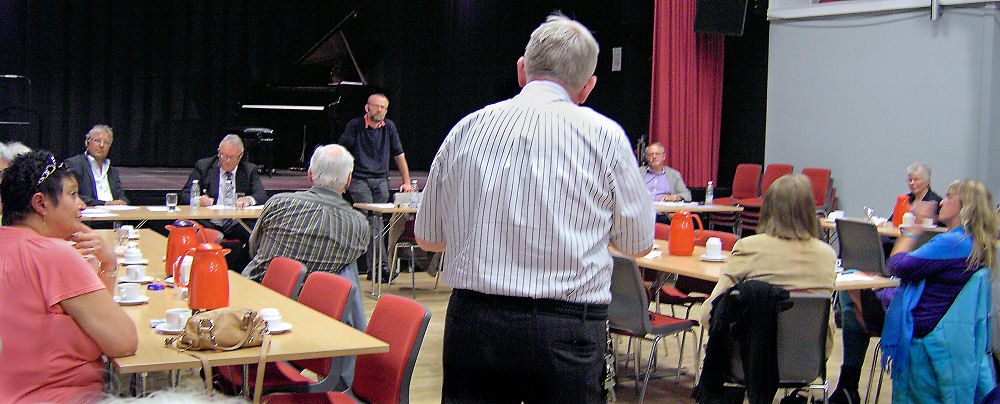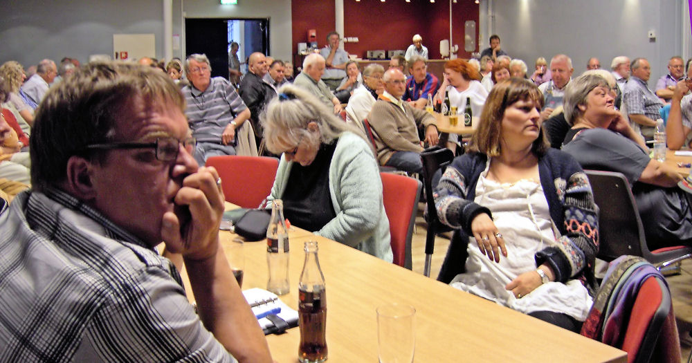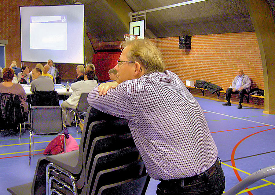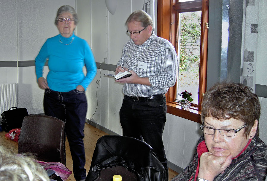 Ib Larsen fra Socialistisk folkeparti har haft en drøftelse med en deltager og gør notater. Ib er udvalgsformand for Natur- og teknikudvalget. Kan det mon dreje sig om at få lusket flere sommerhusgrunde igennem på Omø. Der er allerede udlagt omkring 20 grunde, men de kan ikke sælges. |