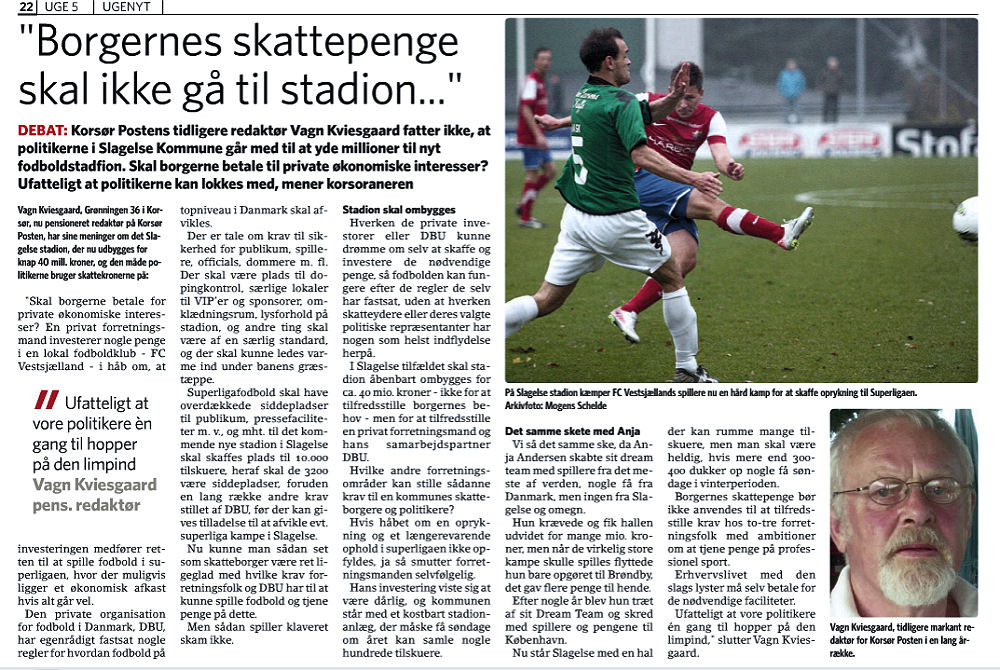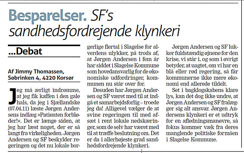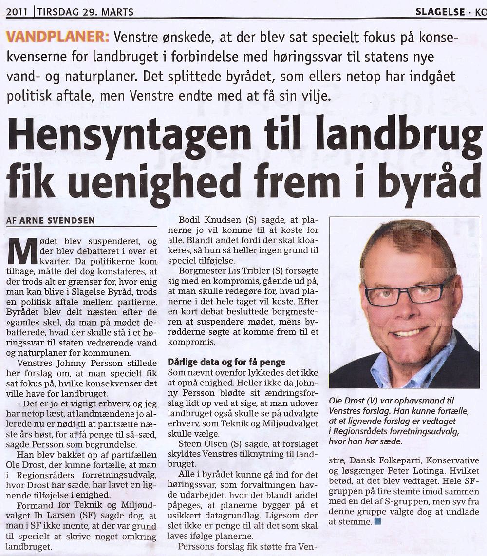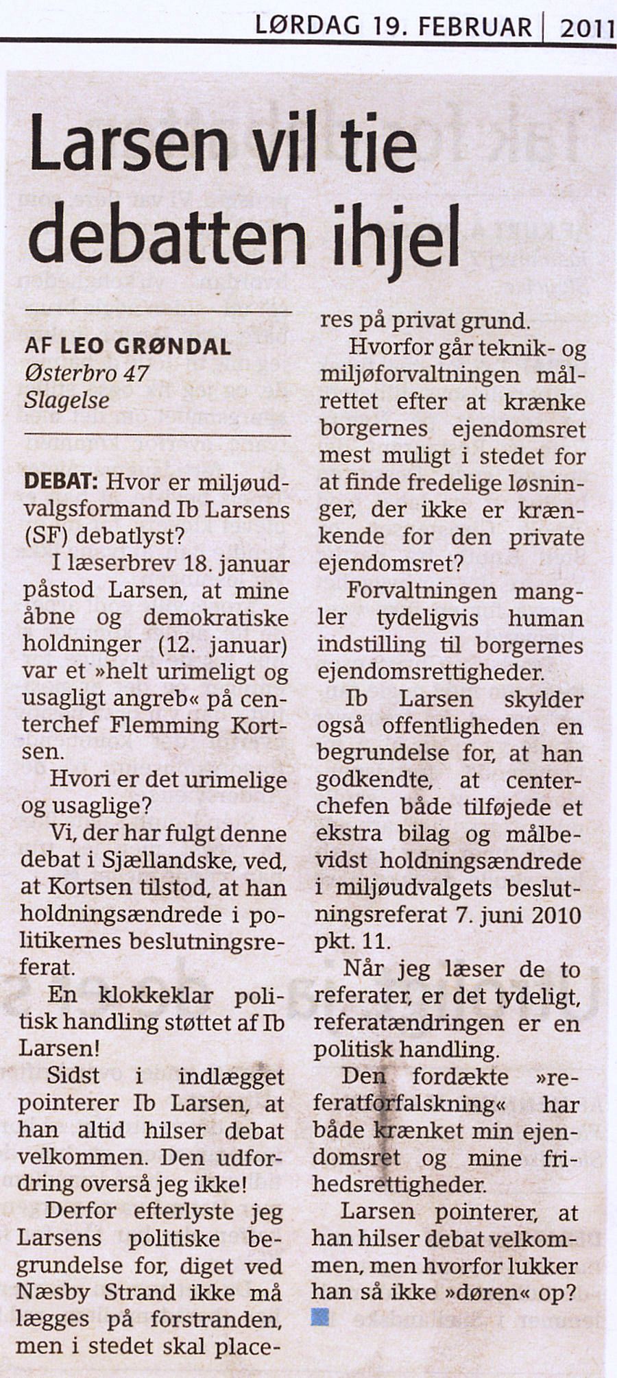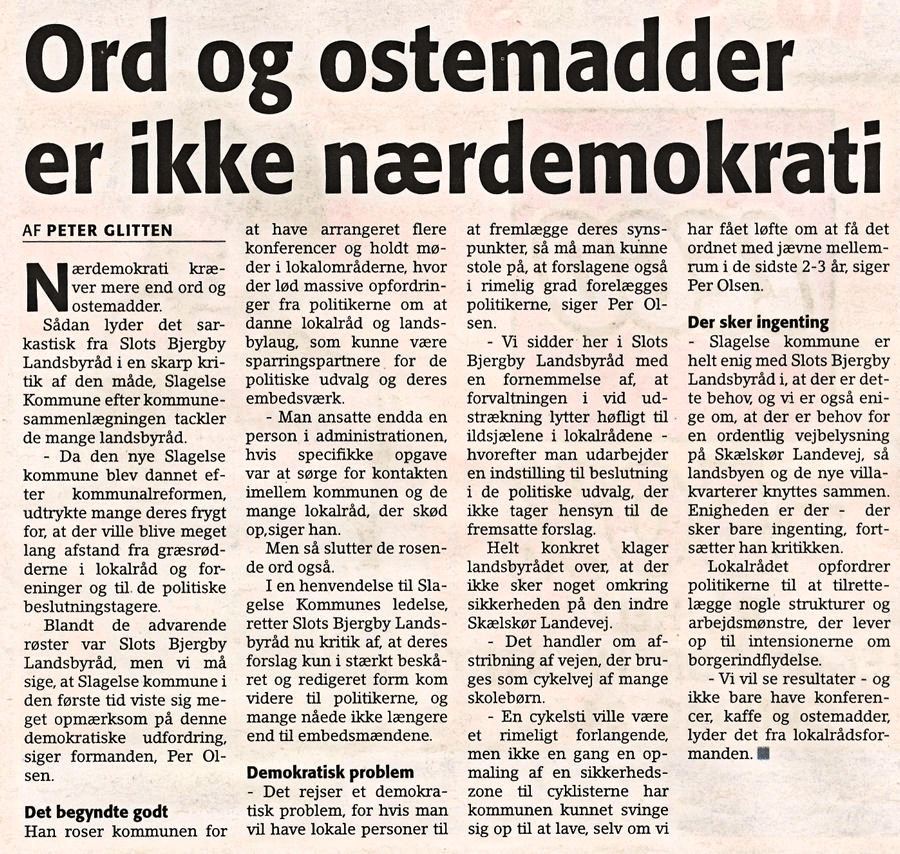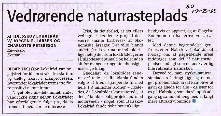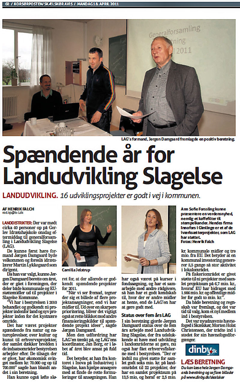 Ovenstående artikel i Sjællandske er egentlig interessant ud over sit indhold. Hvordan kan Per Glitten skrive om mødet uden selv at være til stede. Jeg så ham ikke. Han skriver, at der også var plads til dialog og udveksling af synspunkter mellem borgere og politikere. Det var det vi helst ville have haft - nemlig dialogen og hvordan vi kom videre - denne dialog var særdeles beskeden - der var simpelthen ikke afsat tid eller lagt op til den. Vi var som altid på disse møder statister i et foredragsshow. Nu var det i øvrigt ikke borgere der var indbudt til mødet med Plan- og udviklingsudvalgets medlemmer, men bestyrelsesrepræsentanter for lokalråd og landsbyråd - det var ikke noget offentligt møde. Til den efterfølgende generalforsamling i K.L.R. havde naturligvis kun medlemmerne af K.L.R. adgang. Det er derfor Webmasters opfattelse, at denne lille artikel er fabrikeret af LAG´s formand sammen med Per Glitten. Det ville have været rart om læserne vidste, at det er LAG´s formand Jørgen Damgaard der her har et helt unikt forhold til pressen. Artiklen burde have været benævnt læserbrev af L.A.G.´s formand Jørgen Damgaard. At der skal satses mere på erhverv på landet må stå for formandens egen regning. Det kan også tænkes, at det er kommunens to repræsentanter i LAG nemlig Steen Olsen og Ole Drost, der her via Per Glitten fremkommer med deres synspunkter. Det ved vi bare ikke. De midler som LAG´s snævre kreds styrer og uddeler egenhændigt til de projekter, der falder i den lille i komités smag - her er det erhverv på landet man er syg med - har på ingen måde deltagernes interesse. Deltagerne ønsker projektmidler til de tiltag, som vi som lokalråd og landsbyråd prioriterer højest og det er bestemt ikke erhvervsstøtte. Der er et hav af pengekasser, hvor det altid umættelige erhvervsliv har stukket og kan stikke sin sugesnabel ned. Vi kan sagtens finde anvendelse for pengene til landudvikling og projekter i landdistrikterne til gavn for bosætning, kultur, stisystemer, væresteder, legepladser og masser af ting til gavn for borgerne - ikke lige erhvervsstøtte. Støtte til et firma der fremstiller stempelkaffefiltre, har næppe været formålet med disse midler fra EU og kommunen - og husk lige på, at der her ved kommunen skal forstås de penge, vi som borgere via kommuneskatten betaler. Pengene fra EU har vi som borgere også selv betalt via den danske moms. Det er lige som at klippe halen af en hund og så fodre den lille sultne hund med sin egen hale. Der er ikke noget der kommer af ingenting bortset fra lommeuld, klatgæld og uægte børn. Vor forening tager klart afstand fra at blive taget som gidsler i sådanne erhvervsudviklingsprojekter og blive taget med på et sådant erhvervspolitisk tiltag. Udvikling på landet er langt mere og noget helt andet end erhvervsstøtte. Vor forening er ikke nogen erhvervsforening. Udviklingen og etableringen af det regionale naturformidlingscenter på Lille Tårnborggård kunne være et projekt, men burde anvende de økonomiske midler til at planlægge, etablere og udvikle. Det er en glimrende visionær idé. Formandens kommentar 11. november 2010.