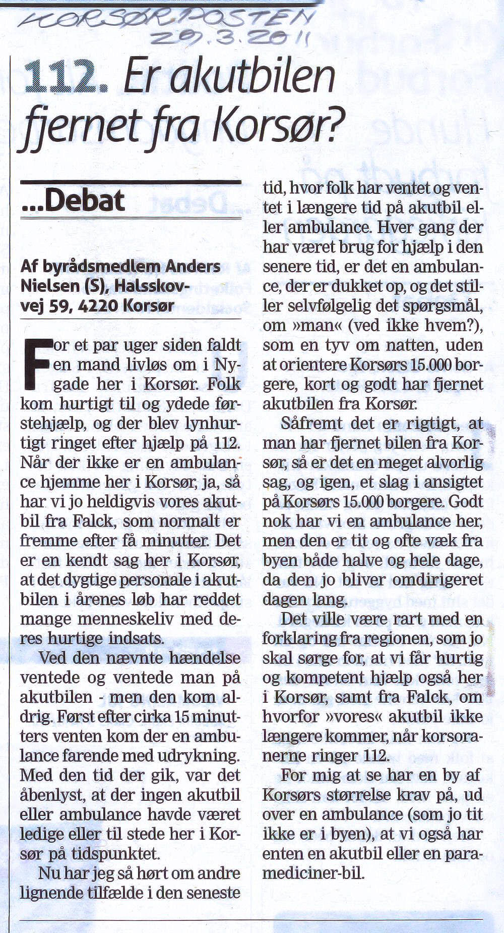 Vi skal blot fra vor forening bemærke, at ved de mindste symptomer på blodpropper i hjernen eller hjerneblødning skal man straks ringe 112 og bede om at patienten bliver ført med helikopter eller ambulance (tager omkring 90 minutter - ak suk) til Roskilde. Her er det nærmeste sted for den mest effektive behandling af den slags - og det kan ikke gå hurtigt nok med at få sat behandlingen i gang. Der hænger en masse hjertestartere rundt omkring, men både ambulancefolk skal vide hvor de findes og folk på stedet skal kunne anvende apparatet - ellers kan det være det samme. Hjerteforeningen burde hellere bruge sin formue på hjerteambulancer med hjertelæge ombord og helikoptre med læger og udstyr ombord. Det viser sig at lynhurtig behandling redder liv og mindsker varige skader. |