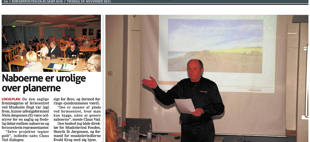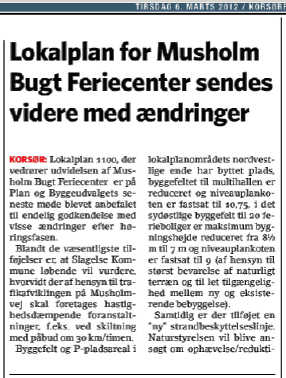 Borgmesteren måtte derfor indlede byrådsmødet med, at ”den sidste uges henvendelser fra borgere og den aktuelle anmodning fra Miljøministeriet” afstedkom, at punkt. 6 (Endelig vedtagelse af Lokalplan 1100 Musholm Bugt Feriecenter, Korsør ) blev taget af dagsordenen.