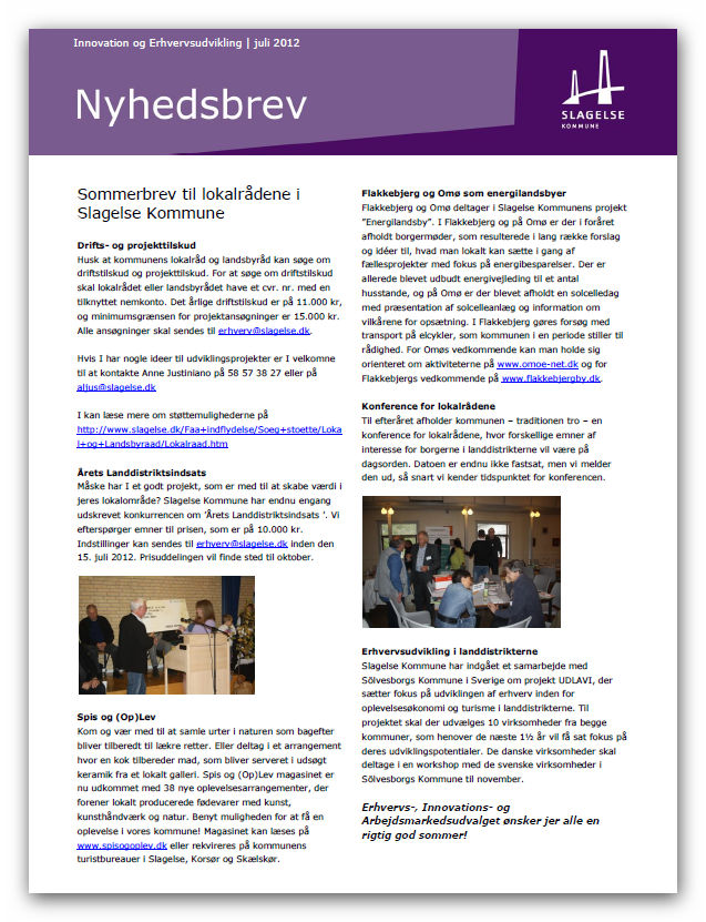 NYHEDSBREV Fra Kontaktudvalget for Lokalråd i Slagelse Kommune (KLR) 27. september 2010. I vores forrige nyhedsbrev beskrev vi problemerne med, at komme igennem til forvaltningen. Siden er det ikke gået meget bedre, og det har været vanskeligt at få sat program og dato på den kommende landdistriktskonference. Sidste år blev alle Lokalråd i kommunen inviteret til Landdistriktskonference i Frederikshavn arrangeret af Indenrigsministeriet, og således er vi også i år blevet inviteret til ministeriets Landdistriktskonference, denne gang til Karrebæksminde d. 17. og 18. september. Invitationen blev ikke formidlet ud fra Kommunen til alle lokalrådene, og det var lidt ærgerligt når nu konferencen blev placeret så tæt på vores område. Men der er lys forude – d. 10. september har KLR modtaget en mail fra vores tidligere kontaktperson, borgerkonsulent Anne Larsen Justiniano. Hun er nu placeret i afdelingen for Innovation & Erhvervsudvikling, og sidder fysisk på det gamle rådhus i Korsør – Anne har overtaget jobbet som forvaltningens kontaktperson for Lokalrådene. Allerede d. 20. september var KLR inviteret til møde med hende, for at få den kommunale Landdistriktskonference på skinner igen. Datoen er fastsat til d. 6. november i Gimlinge Forsamlingshus. Det foreløbige program i overskrifter er: Morgenkaffe og velkomst Indlæg om nye initiativer i kommunen, især fra Landudvikling Slagelse. Indlæg om Lokale Udviklingsplaner, herunder besøg / indlæg fra Røsnæs, der har udarbejdet en færdig udviklingsplan for hele ”næsset”. Frokost Generalforsamling i KLR.