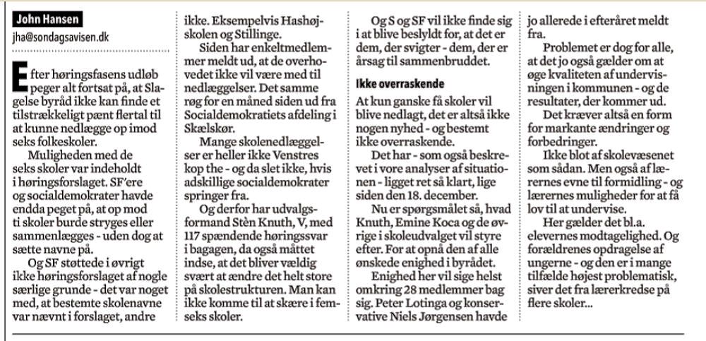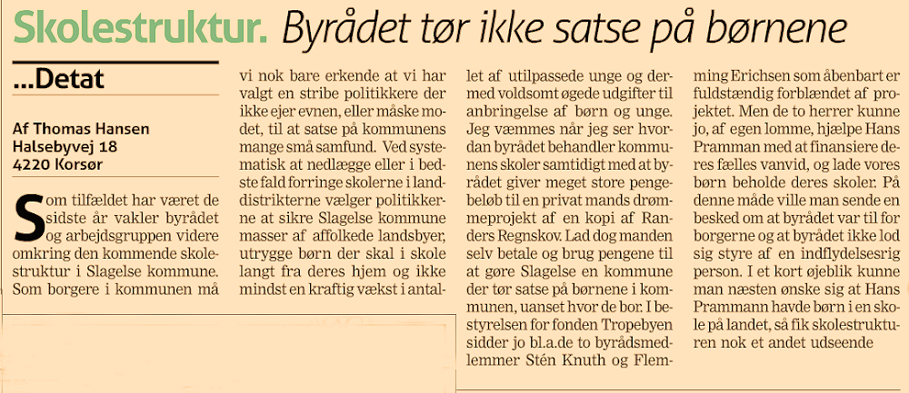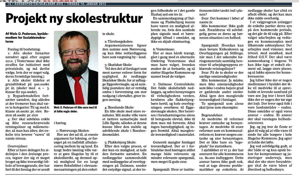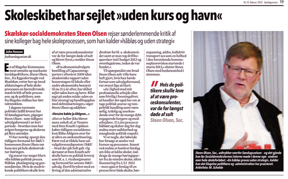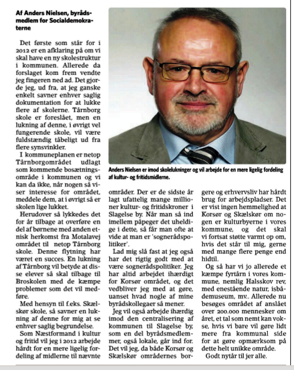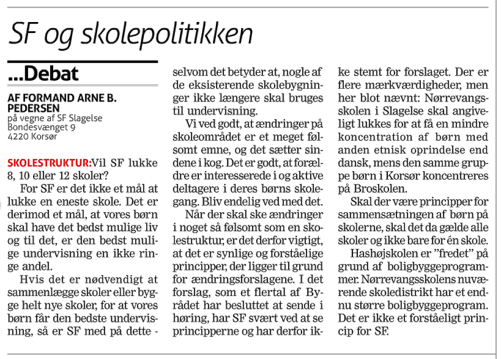 Jørgen Andersen (SF), som du ser på billedet ovenfor og som har den modige mening, at man bør få lukket nogle skoler, når man har for mange af disse og alt for få elever i Slagelse kommune - har sendt mig et par kommentarer til den håbløse situation på skoleområdet: