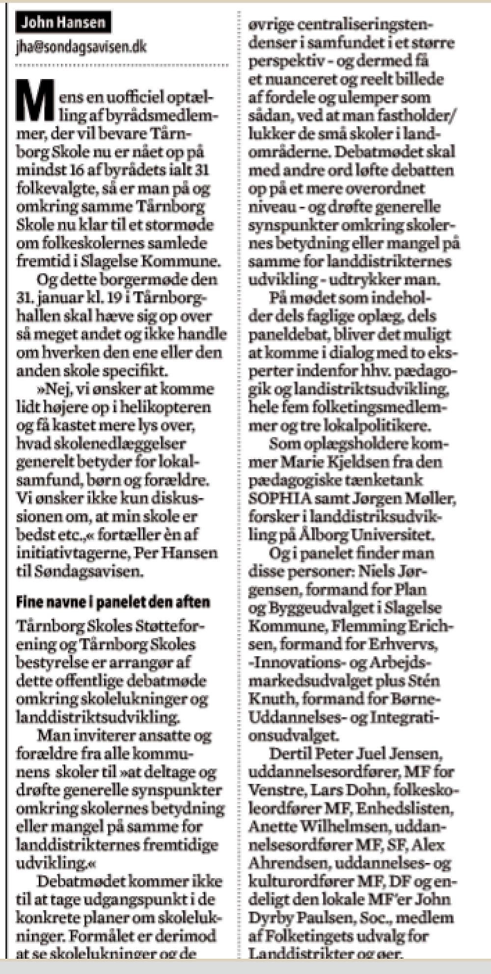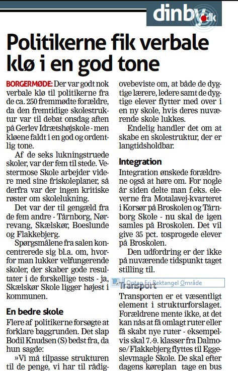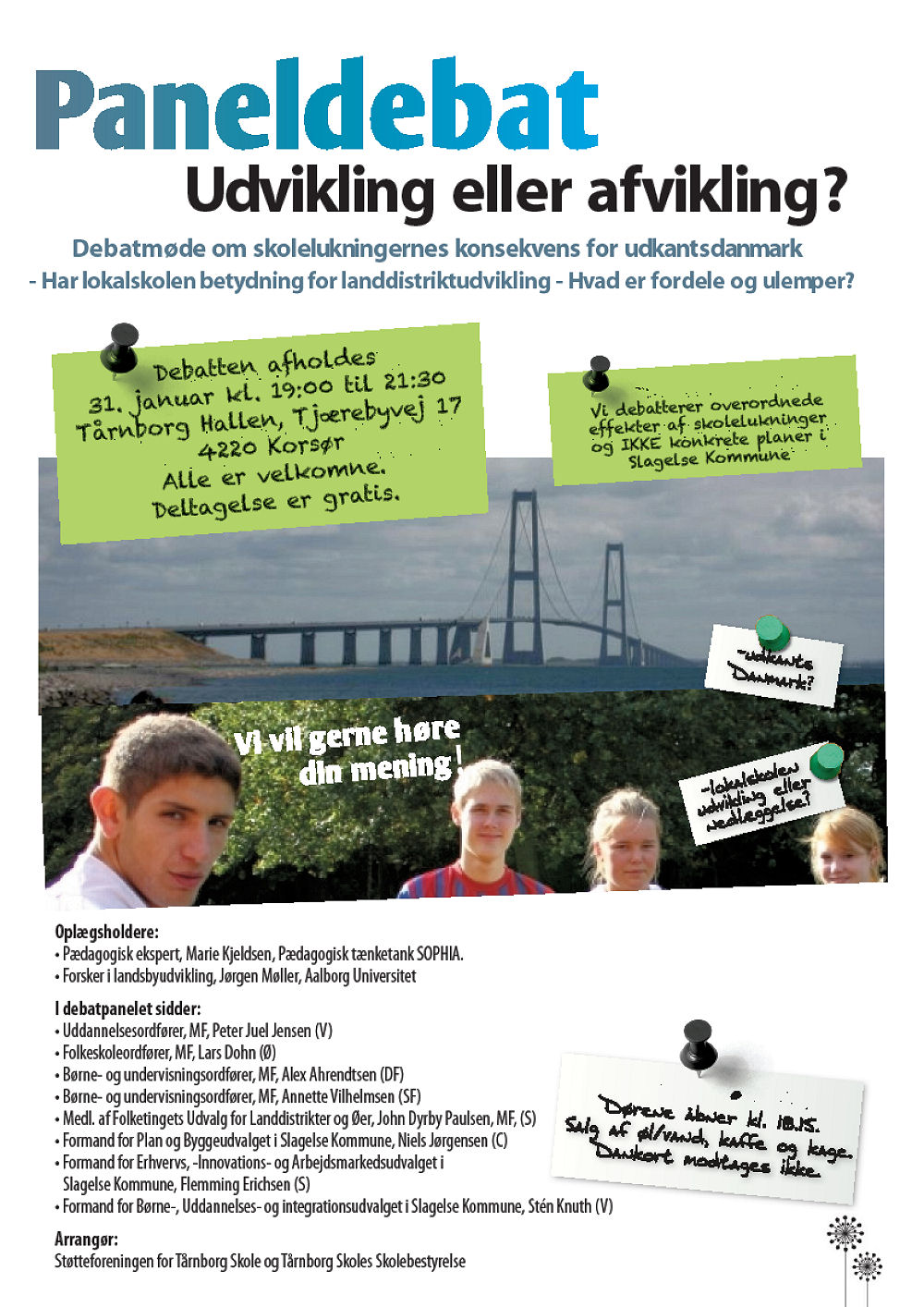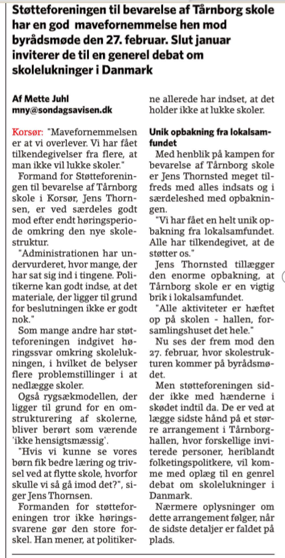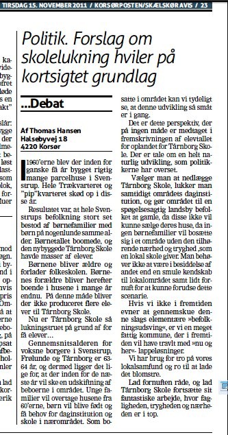 Vor forening blander sig ikke politisk i denne sag, men da vi som lokal forening er høringsberettiget, skal vi nok give vort besyv med via et høringssvar. I øvrigt kan man jo ikke udelukke, at det er forsvarligt at lukke en del skoler, når børnetallet er faldet og fortsat er faldende. Det synspunkt kan jo være lige så relevant, som at bevare skoler. Vor forenings opgave er at arbejde for lokalområdets fælles interesser og fremme udviklingen i vort virkeområde. Det er jo ikke lige det - en lukning af Tårnborg skole fremmer. Webmasters kommentar |
