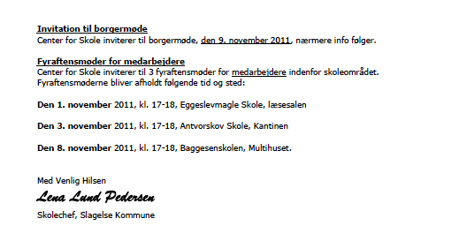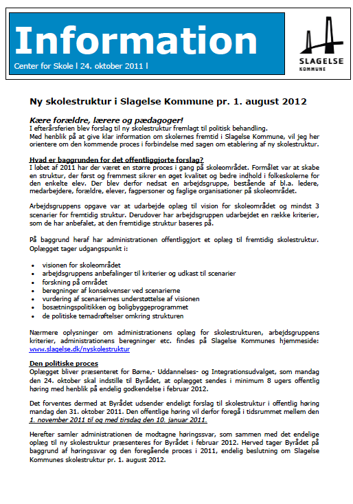 Sagens indhold I forbindelse med høringsperioden for den fremtidige skolestruktur i Slagelse Kommune, afholdes der borgermøde den 9. november. Tid og sted er endnu ikke fastsat.