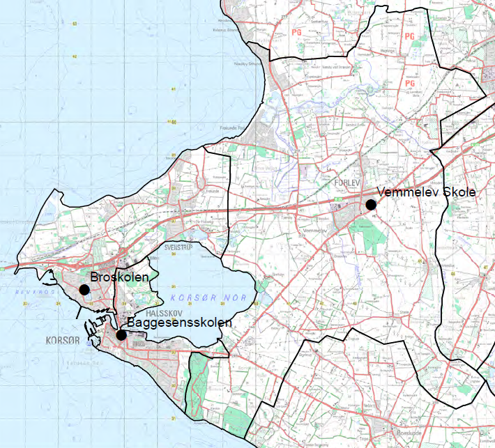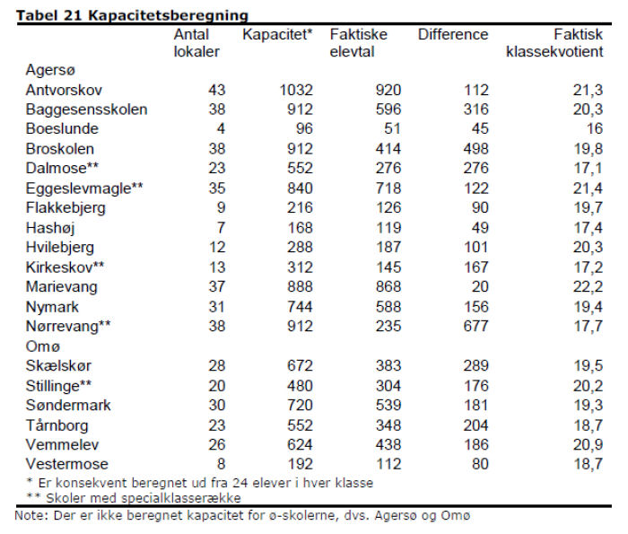 Administrationen anbefaler, at følgende skoler fastholdes med fuldt forløb: · Baggesenskolen · Broskolen · Vemmelev Skole · Marievangsskolen · Antvorskov Skole · Søndermarkskolen · Nymarkskolen · Eggeslevmagle Skole, med en afdeling på Agersø Skole 0-6. klasse · Stillinge Skole (på grund af afstanden til og manglende kapacitet på de nærmeste alternative skoler)