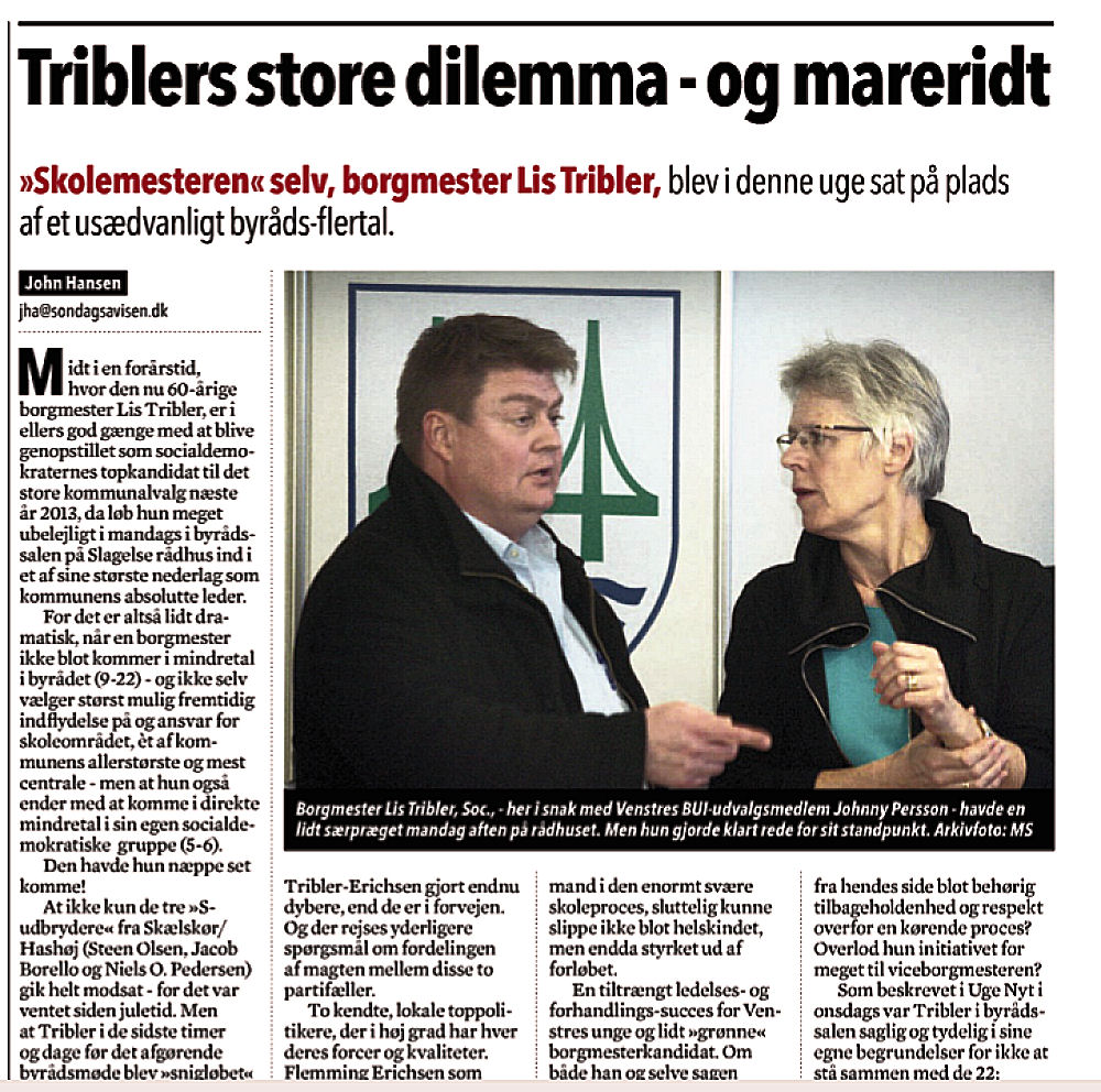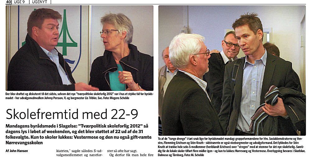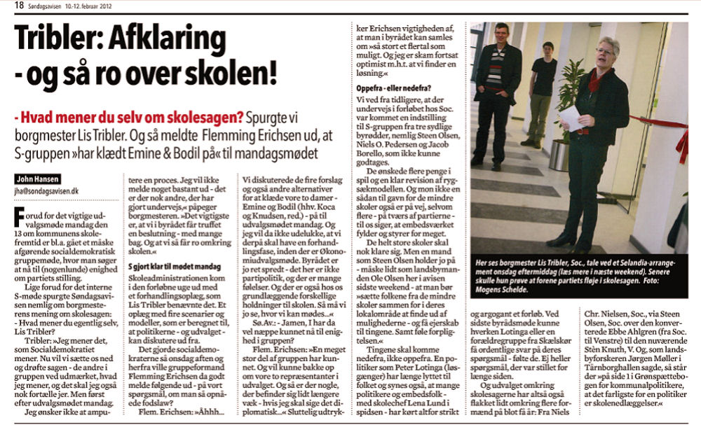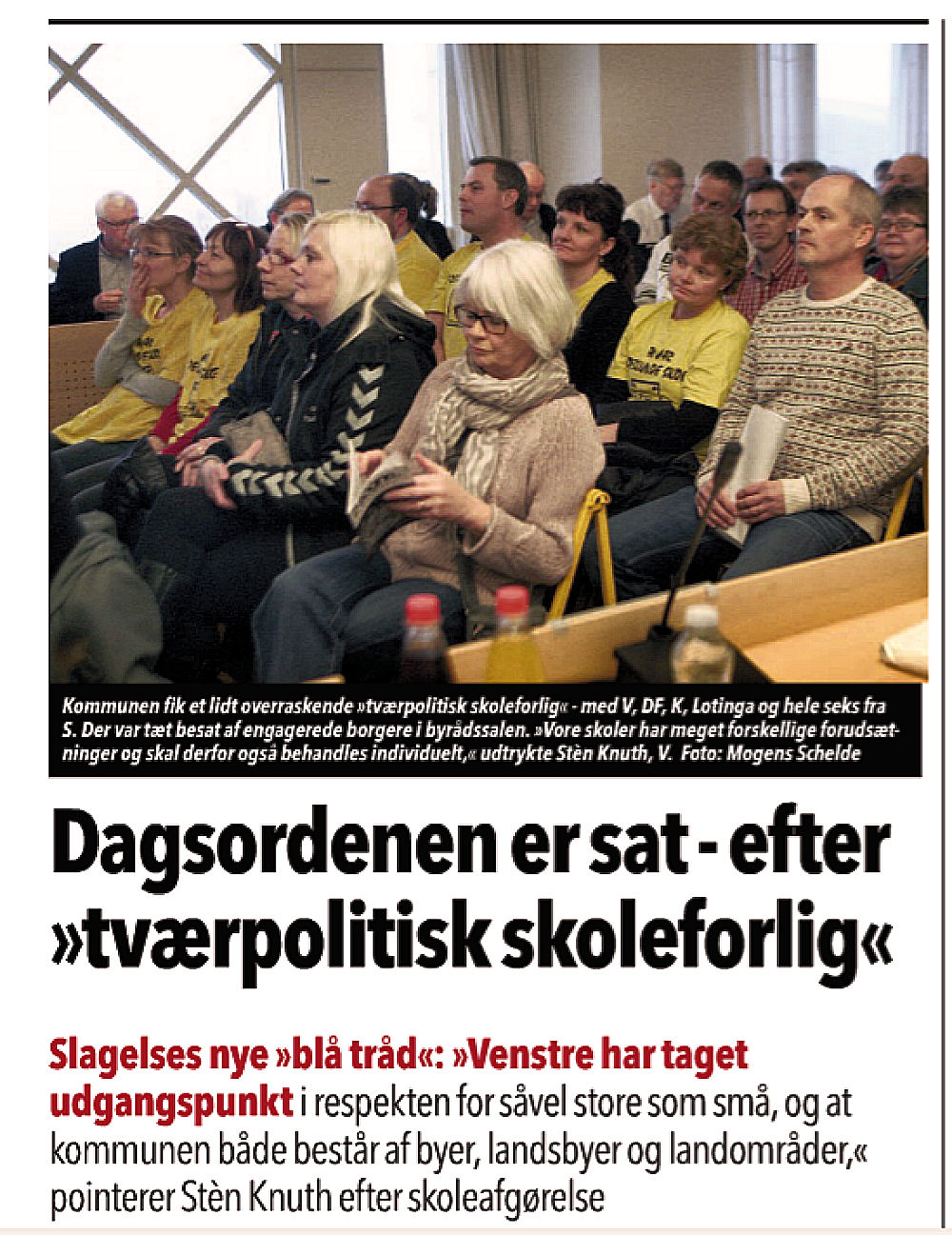 " ... Borgmester Lis Tribler er stærkt bekymret for økonomien i den nu vedtagne skolestruktur. Det vil kræve, at det indgåede budgetforlig brydes. Stén Knuth er dog optimist og er overbevist om, at byrådets 22-9 flertal nok skal finde pengene. Og så har V en vision.