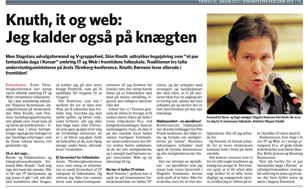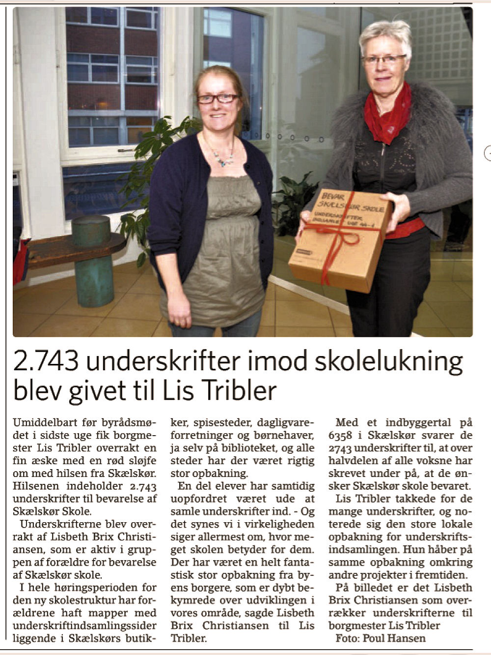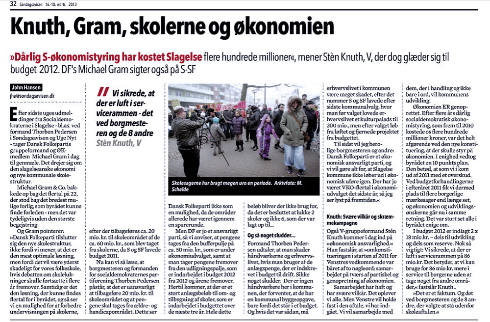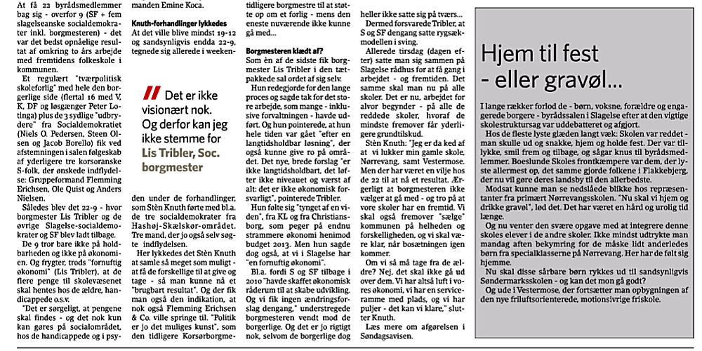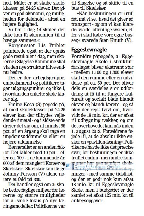 " ... Borgmester Lis Tribler er stærkt bekymret for økonomien i den nu vedtagne skolestruktur. Det vil kræve, at det indgåede budgetforlig brydes. Stén Knuth er dog optimist og er overbevist om, at byrådets 22-9 flertal nok skal finde pengene. Og så har V en vision.
