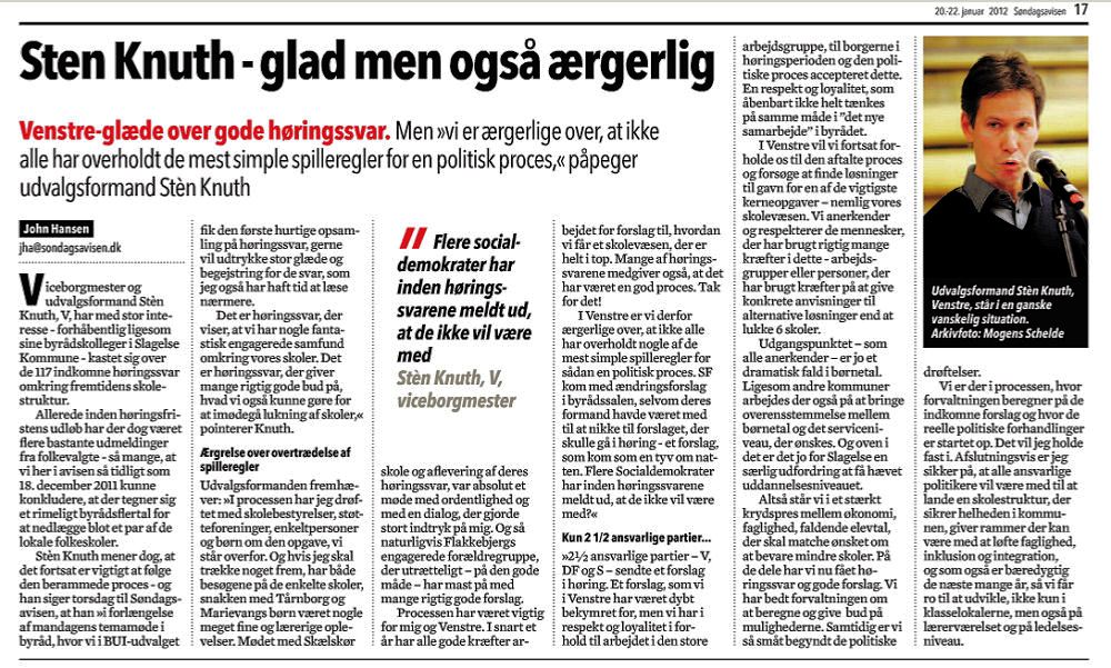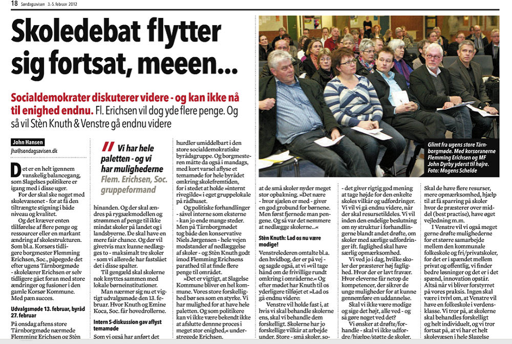 | 21. februar 2012 KOMMENTAR: Det er ikke godt. Stén Knuth kan ikke magte opgaven som udvalgsformand og få skabt et bredt flertal. Venstre ønsker tilsyneladende kun at hyppe egne kartofler - de skal ikke have lukket nogle skoler, hvor de har deres kernevælgere og det er især ude i "bondelandet". Det er et gennemgående træk i mange høringssvar, at man finder at Stillinge skole lige skulle holdes fri var venstremanipulation og at det uanstændige skolebyggeri i Hashøj (Slots Bjergby) skulle fremmes er en torn i øjet på mange. Socialdemokraterne er splittede og ved ikke lige rigtig hvad de vil. Enige er de ikke. Det at de vil bevare Nørrevangsskolen viser, hvor useriøse man er. Skolen har plads til 967 elever og der går i dag omkring 200 på den. Det ville have været en god idé at få spredt de to-sprogede og elever med en vanskelig socio-økonomisk baggrund ud blandt mere ressourcestærke børn. Socialistisk Folkeparti holder fast i det de hele tiden har sagt nemlig: Vi har alt for mange skoler til alt for få elever og da prognoserne viser at elevtallet falder og falder er vi nødt til lukke skoler. Vi ønskede at få bragt stort set alle skoler i spil og at alle skoler skulle behandles ens. Vi vil ikke være med til at nogen skoler skal fredes og andre skal slagtes. Vi vil tilgodese helheden og vort mål er at skabe de bedste muligheder for alle børn og ikke kun for nogle børn. Det er ikke populært, men det er at vise ansvarlighed. Deres holdning til ikke at ville lukke Nørrevangsskolen viser, at de dog har en skjult dagsorden. De mener ikke de skal genere deres kernevælgere i Nordbyen og har stor lyst til "at give venstre en på trynen". Vi tror i øvrigt ikke rigtigt på at de fire byrådsmedlemmer i SF er enige i denne sag, men de holder dog sammen ud ad. Dansk Folkeparti viser sin manglende seriøsitet ved ikke at ville bløde op på rygsækmodellen. Borgmesteren vil tilsyneladende ikke invitere Peter Lotinga med til mødet. Det er ikke klædeligt. Han var faktisk den eneste der har fået ret i denne sag. Han ville ikke have sagen i høring fordi han påstod, at man ikke kunne sende noget i høring som ikke havde udsigt til at have et politisk flertal bag sig. Selvfølgelig skal han med til mødet. Nu vil borgmester Lis Tribler forsøge sig som politisk kandestøber onsdag aften. Men som bekendt: "... et er søkort at forstå. Et andet skib at føre ...". Når den erfarne højrehånd Flemming Erichsen ikke kan finde et fælles fodslag med Stén Knuth kan hun næppe heller. Det ville også være klædeligt at se lidt på de tre socialdemokratiske udbryderes forslag. Det er faktisk slet ikke så ringe endda. Mandag den 27. februar skal "slaget slås". Vi tror på at løsningen bliver at Vestermose og Nørrevangsskolen bliver lukket og at en del skoler bliver "fødeskoler" samt at rygsækmodellen bliver blødt op med omkring 15 millioner kroner. Det kan man overleve politisk på til efter kommunevalget uden at miste vælgertilslutning. Men dermed er sagen ikke løst. "Det er som at tisse i bukserne, der varmer lige her og nu, men så bliver det rigtig klamt og koldt". Løsningen kan holde maksimum 2 til 3 år, så er man nødt til at lukke flere skoler og nogle har endog lukket sig selv. Vi har i øvrigt fået oplyst og verificeret, at eksempelvis Broskolen i Korsør giver lov til at elever fra Motalavej nord, der hører til Tårnborg skoledistrikt kan gå på skolen - herved reduceres elevtallet på Tårnborg skole og den integration man ønskede fremmet bliver sat over styr. Dette sidste kunne man sagtens have dæmmet op for fra både skoleforvaltningens og politikernes side. Webmaster