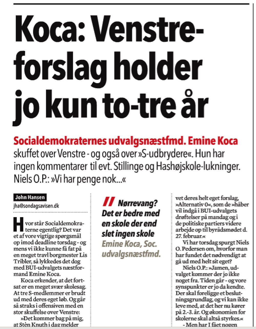 Det var på den baggrund at SF og Emine Koca var imod en lukning af Nørrevangsskolen - faktisk et sympatisk træk. Det er også her de har deres kernevælgere.