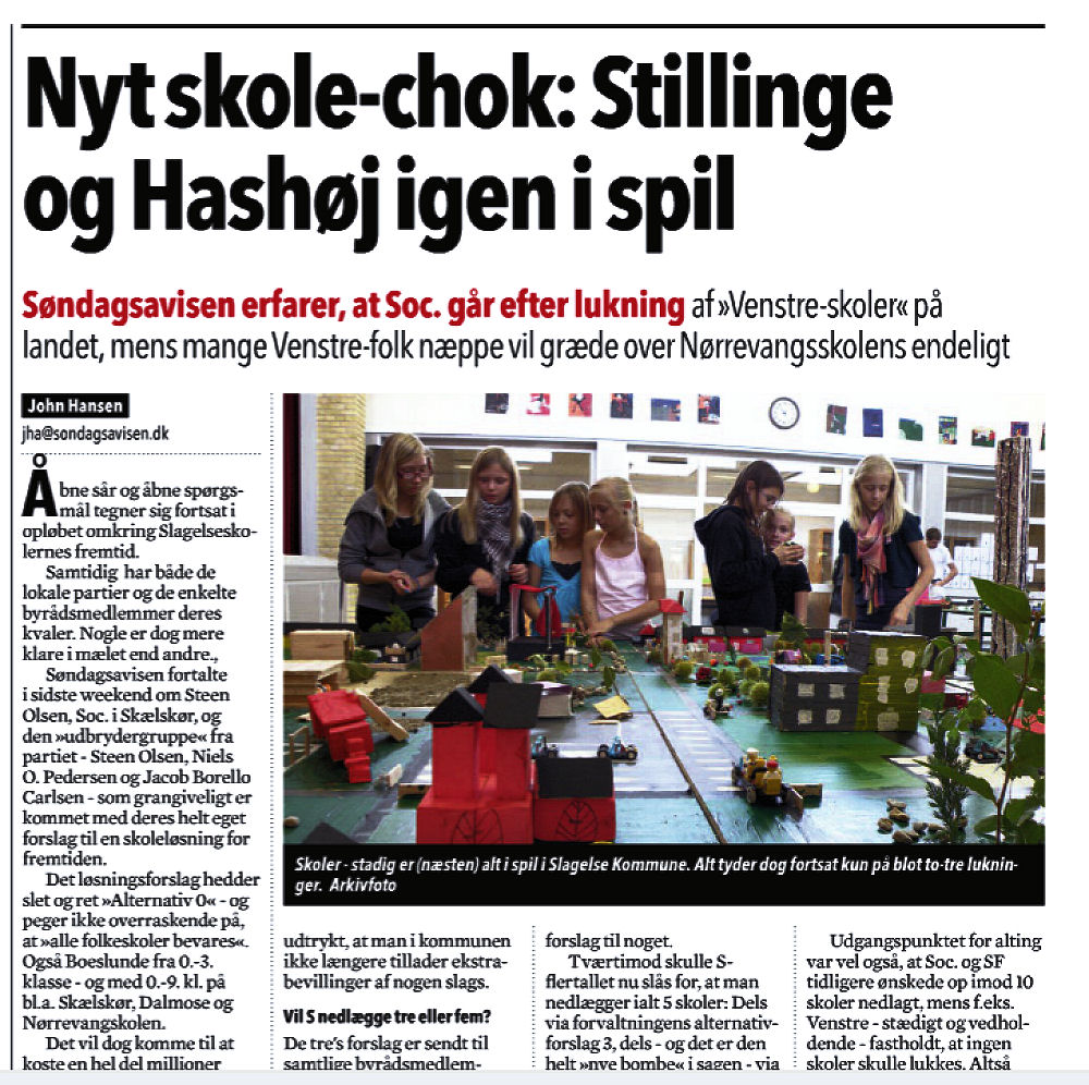 | I hele denne forklaring mangler vi lige at få fortalt, hvordan man får 125 millioner kroner til at bygge en skole i Slots Bjegby i et projekt i tilknytning til Gerlev Idrætshøjskole fordi man mener man skal have plads til 425 børn og ikke kun de 125 børn man har i området og som i dag går på Hashhøjskolen Der er tilsyneladende ingen sammenhæng mellem lukning af skolerne og bygning af en ny. Vi undrer os bare. En forklaring mangler ! Webmasters kommentar |