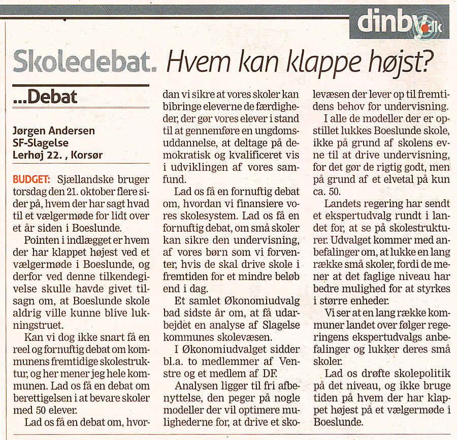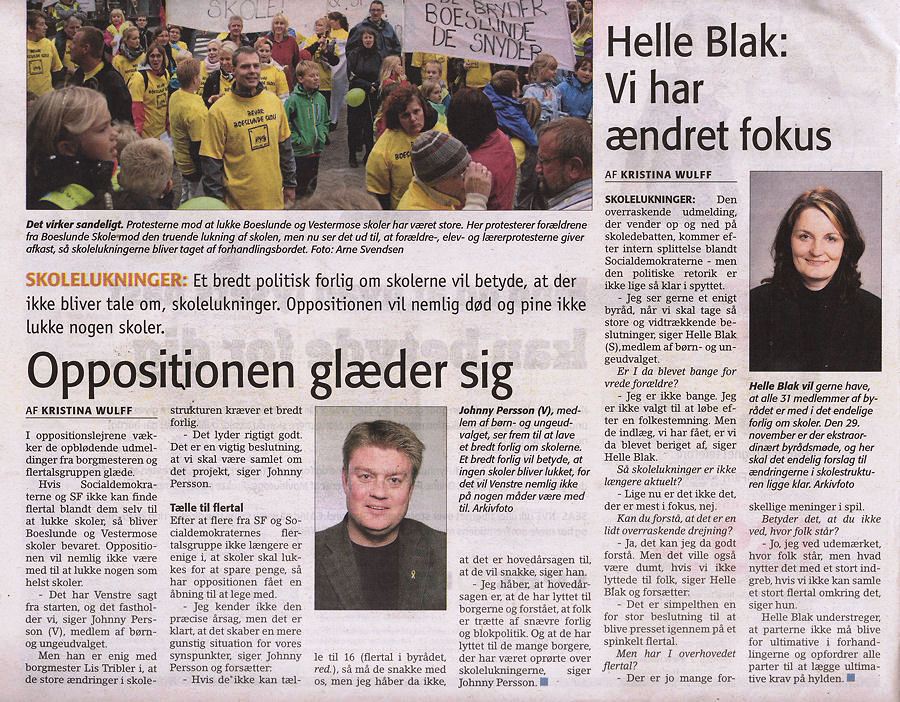 Skoleområdet"Folkeskolen i Slagelse Kommune er i god udvikling. Forbedrede resultater i læsetests og en markant stigning i afgangselevernes eksamensgennemsnit er dokumentation herpå. S og SF ønsker at fortsætte denne udvikling. Det nødvendiggør en ændring af den samlede skolestruktur. Derfor indledes nu en dialog med de involverede parter om at lukke Boeslunde Skole og Vestermose Skole og igangsætte et udviklingsprojekt for Flakkebjerg / Dalmose-området, hvor hele 0-18 års området indtænkes.