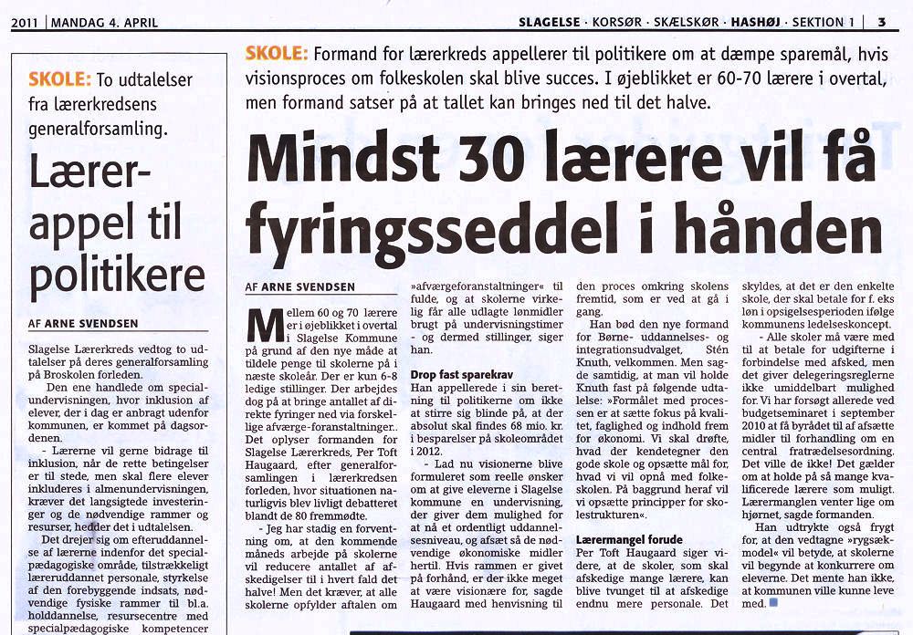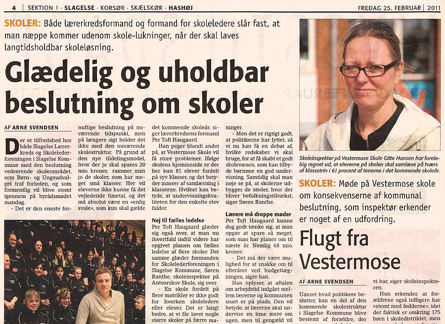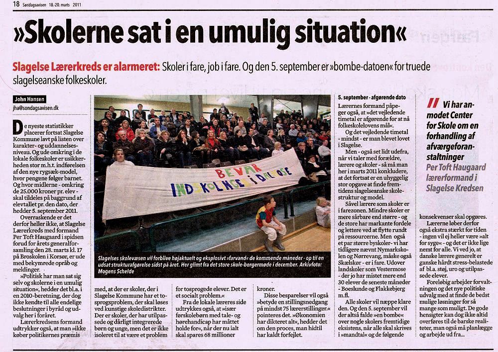 ![]() | Her har du slagelse lærerkreds bestyrelse Webmaster har den opfattelse, at de bedste til vurdere problemerne og tilstanden er lærerne, der til daglig ved hvor skoen trykker. Det skriftlige referat var tilgængeligt i dag den 8. april 2011. Politikerne fatter ikke i substansen i det her. Derfor har vi oplevet det totale kaos og en usikkerhed til, at træffe fornuftige og saglige beslutninger. Overvejer du i øvrigt, at lade dit barn indskrive i privatskole? |