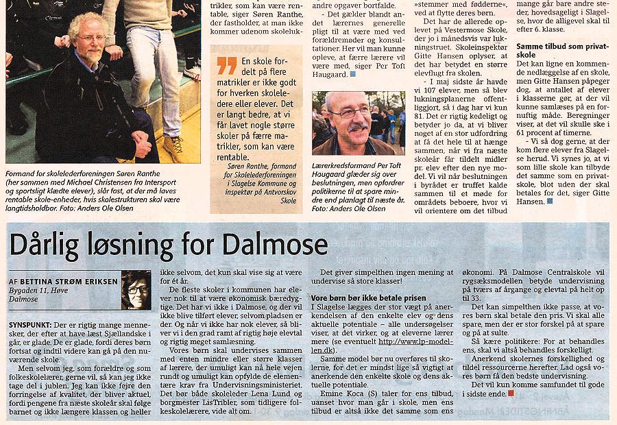 Socialdemokraterne og Socialistisk Folkeparti har indgået budgetforlig. Der forventes endeligt vedtaget ved 2. behandlingen mandag den 11. oktober 2010. (Det blev vedtaget, men der kom forskellige udmeldinger vedrørende skoleområdet. Nu starter der en høringsfase og først i december måned bliver noget endeligt afgjort om skolenedlæggelserne og skoledistrikternes fremtidige udseende. webmaster den 12.10.2010) Løsningsmodellen for besparelserne på skoleområdet tager udgangspunkt i den analyse, der er blevet udarbejdet af CAPACENT - her vælger man en tilpasset model C. Man arbejder med lukning af 2 skoler, men det kan sagtens ende op med flere. Det indebærer følgende: 1) Pengene følger nu eleven og ikke klassen (uanset elevantal i klassen) - det betyder at elevantallet i klasserne skal op på 24 (28) elever. I modsat skal de manglende penge gives fra en råderumspulje. Man vil ikke acceptere, at de skoler der har klasser med et elevtal så lavt som 12 får de samme penge pr. klasse som en klasse med 24 elever. Det nuværende system er en økonomisk forfordeling af de skoler, der ikke kan holde en rimelig klassekvotient. 2) Man forventer at kunne forhandle sig tilrette med lærerne om, at de omlægger arbejdstiden således, at de underviser 1 time mere om ugen. Det indebærer, at der skal aftales en ny lærertidsaftale. Lærerne i Slagelse kommune underviser i snit 614,5 timer om året. Man har sammenlignet med 5 sammenlignelige kommuner - her underviser lærerne 641,9 timer. Her er et potentiale på 27,4 timer pr. lærer pr. år. Det er da tankevækkende, at lærerne kun anvender omkring en tredjedel af den årlige arbejdstid til undervisning og samvær med eleverne. 3) Man forventer af afskedige 75 lærere. Det kunne ske ved at lade de ældste lærere fratræde først. 4) Man ændrer skoledistrikterne og gør dem større og kommer ned på 12 skoledistrikter måske 11 eller helt ned på 10. Vi har i dag 19 skoledistrikter. Herved kan man samle eleverne fra de større distrikter i større klasseenheder.