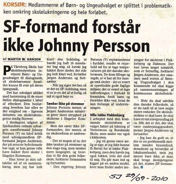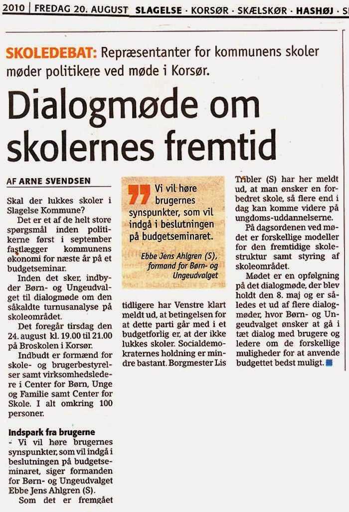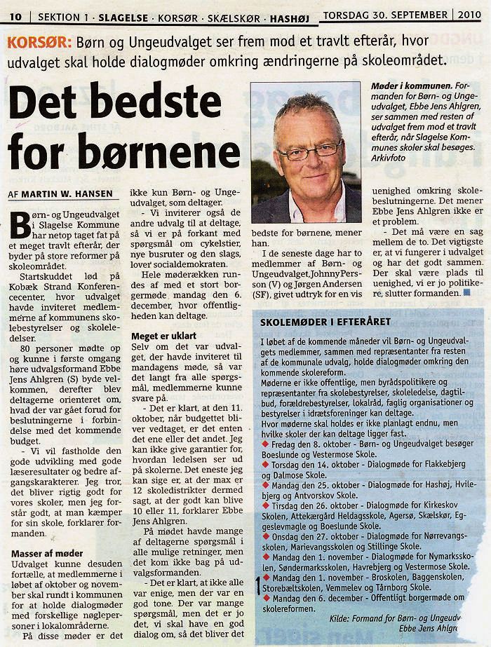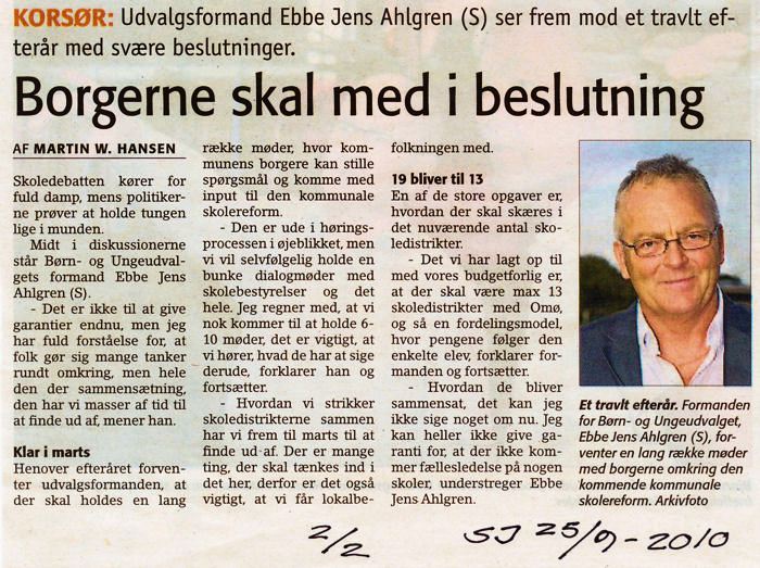 Ebbe Jens Ahlgren, formand børne- og ungeudvalget (Socialdemokraterne) Her er den spritnye Socialdemokratiske udvalgsformand for børne- og ungeudvalget hvorunder skoleområdet sorterer, Ebbe Jens Ahlgren. Ebbe kommer fra Korsør og er forhenværende politimand. Efter samarbejdsvanskeligheder mellem udvalgsmedlemmet Johnny Persson fra Venstre og udvalgsformanden Steen Olsen fra Socialdemokratiet, har socialdemokraterne accepteret at Steen måtte trække sig og lade Ebbe komme til. Det er i sig selv en sag, fordi Ebbe er gået mod sine egne og har sikret sig formandsposten til en årlig gage på 172.000 kr. Det er godt gået, som nyt medlem af Slagelse byråd med beskedne 270 personlige stemmer. Han har dog sikret sig pladsen ved et seriøst målrettet lokalt engagement, som vælgerne har belønnet. Hans force er dog færdselssikkerhed og indsigt i mange problemstillinger fra sit politiarbejde. Steen er nok selv årsag til, at det er kommet så langt. Det bliver Ebbe der i første omgang skal lede forhandlingerne omkring budget 2011 på skoleområdet. Det kan gå hen og blive øretævernes holdeplads. Det er næppe sandsynligt, at oppositionen freder ham. Han er personligt gode venner med venstres Johnny Persson, der også har plads i udvalget. Dette er formentlig direkte årsagen til, at Ebbe kunne komme i spil - det er tænkeligt at Ebbe har truet med at forlade socialdemokratiet og tilslutte sig venstre - vi ved det ikke, men noget voldsomt dramatisk må have været kastet ind i ringen, for at den socialdemokratiske byrådsgruppe og partiforeningernes fællesledelse har accepteret en sådan løsning. Det giver måske lidt ro i første runde. Ved formandsskiftet har man dog fået "lukket luften" ud af venstres og dansk folkepartis kritik. Vi håber han kan løfte opgaven og vor forening ønsker ham lykke og held med opgaven.